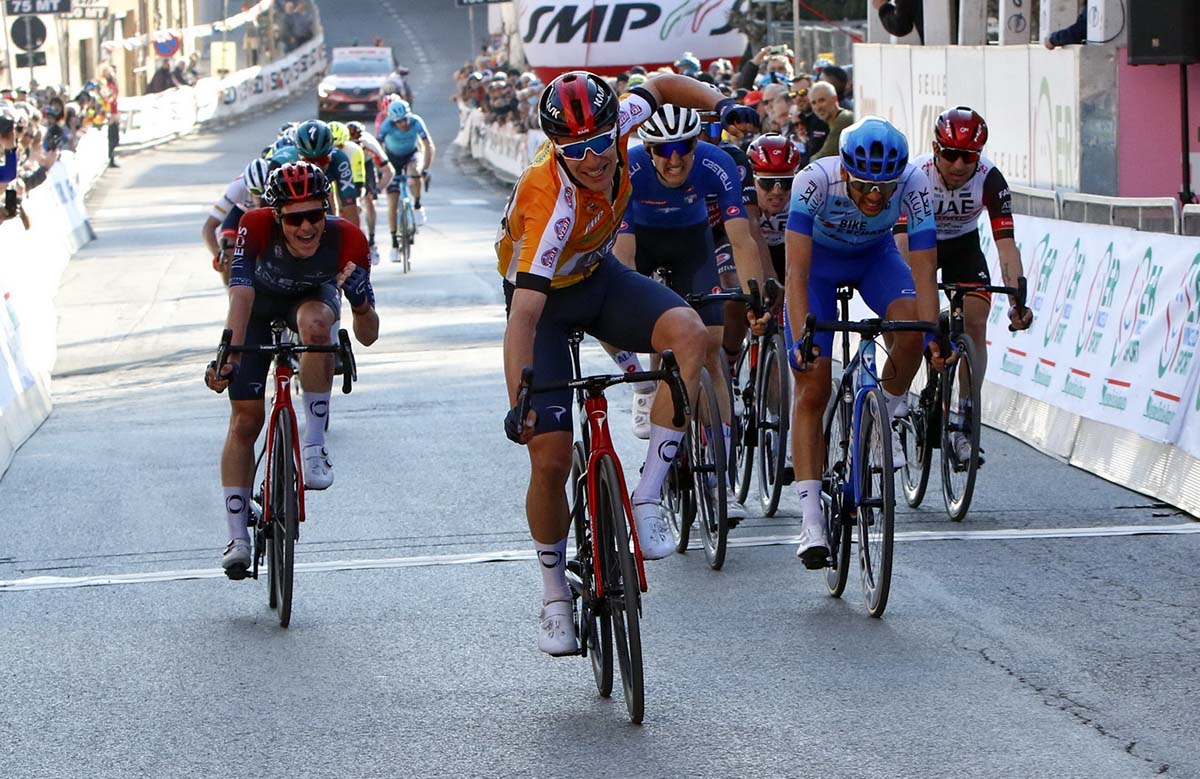 Proprio sulle ultime ascese si staccano Van der Poel e lo stesso Thomas. Davanti restano in trenta, che si assottigliano fino ad una ventina scarsa. Fra questi, a tre chilometri dal traguardo prova l’assolo il colombiano Andres Ardila (UAE Team Emirates), che viene ripreso a cinquecento metri dall’arrivo, sullo strappo finale. Il successo, dunque, se lo gioca in volata un plotoncino ristrettissimo, con Hayter che precede Sobrero (Team BikeExchange-Jayco) e Tulitt (anche lui della Ineos Grenadiers).