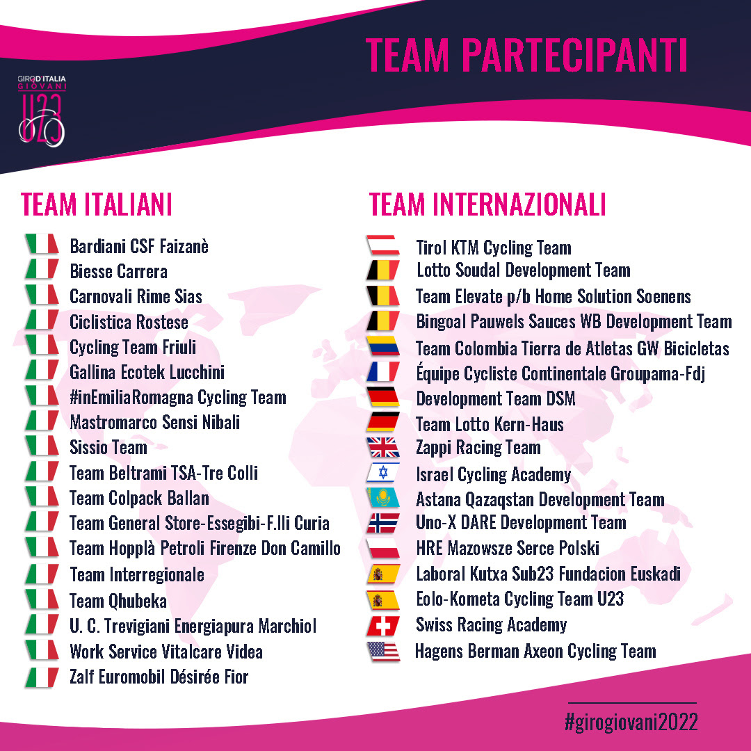 Al via della più impegnativa e ambita corsa a tappe al mondo per ciclisti Under 23 ci saranno team provenienti da 14 Paesi: Austria, Belgio, Colombia, Francia, Germania, Gran Bretagna, Israele, Italia, Kazakistan, Norvegia, Polonia, Spagna, Stati Uniti e Svizzera.