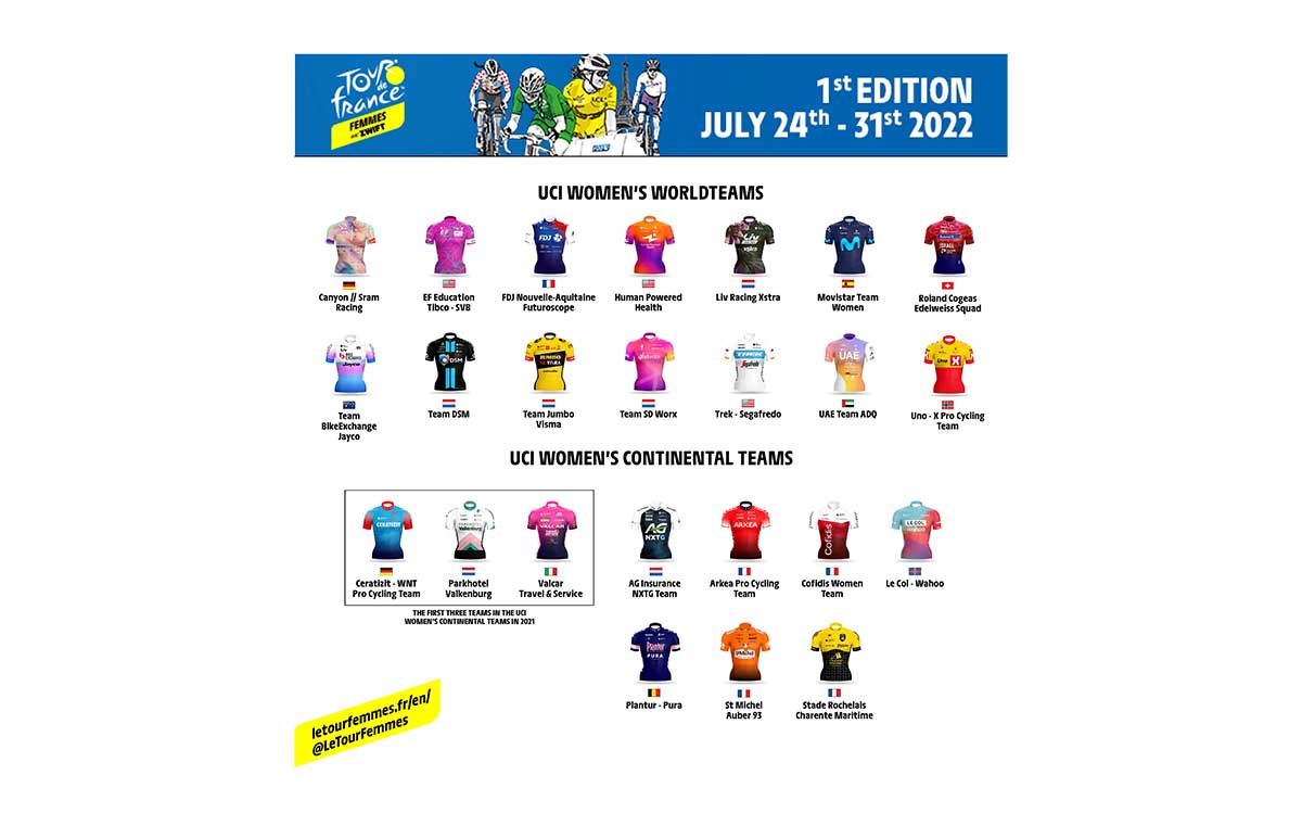 Secondo i regolamenti dell’Union Cycliste Internationale (UCI), le 14 squadre UCI Women’s WorldTeams sono iscritte di diritto: