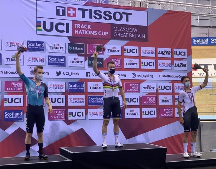 GLASGOW (GRAN BRETAGNA) – Eliva Viviani, con la maglia di campione del mondo, vince la prova ad eliminazione maschile della Nations Cup in fase di svolgimento a Glasgow, in Scozia. Il veronese, ieri sera, con una gara autorevole, ha avuto la meglio sull’olandese Yoeri Havik. Bronzo al tedesco Tim Teutemberg.