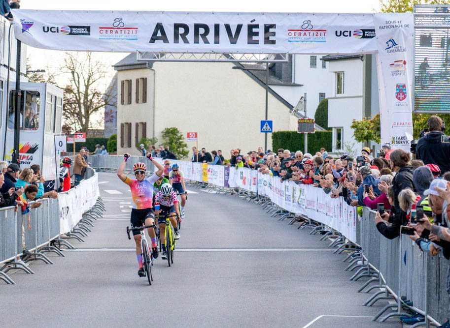 STEINFORT (LUSSEMBURGO) – Una giornata perfetta. Non ci sono altre parole per descrivere la straordinaria performance offerta oggi dall’UAE Team ADQ. L’italiana Marta Bastianelli, 35 anni compiuti oggi, ha vinto la prima tappa del Ceratizit Festival Elsy Jacobs, 121,4 chilometri con partenza e arrivo a Steinfort, in Lussemburgo, finalizzando al meglio il lavoro perfetto di tutto il team (foto Manuela Heres).