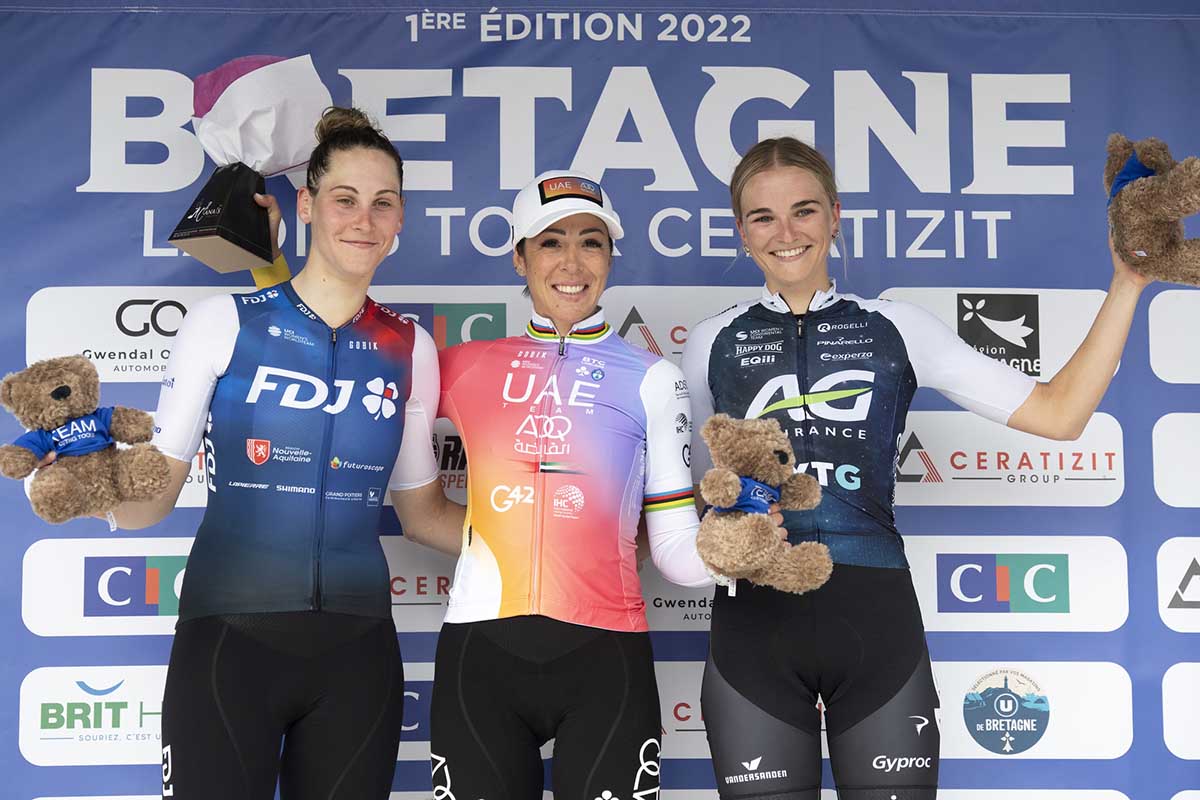 Il podio della prima tappa del Bretagne Ladies Tour 2022 (foto SprintCyclingAgency)