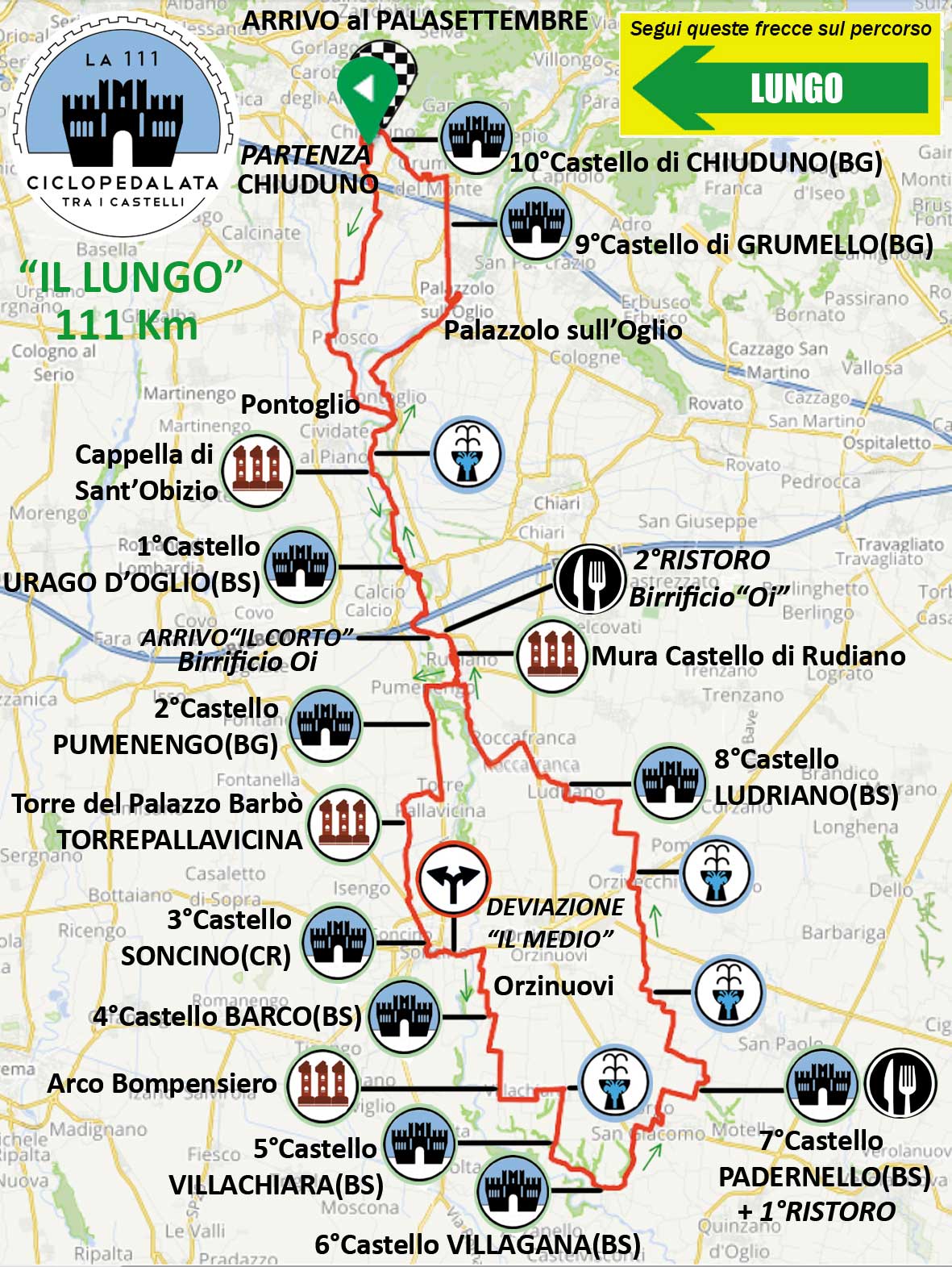 CHIUDUNO (BG) – La “Ciclopedalata tra i castelli”, conosciuta come “LA 111”, è una suggestiva manifestazione ciclistica non competitiva, inserita nel calendario F.C.I., aperta a tutti (anche non tesserati), che si snoda tra la pianura delle provincie di Bergamo, Brescia e Cremona, attraversa 10 castelli, incorrendo in brevi saliscendi, tratti di pavè, ciclabili e spettacolari paesaggi del Parco Oglio Nord.