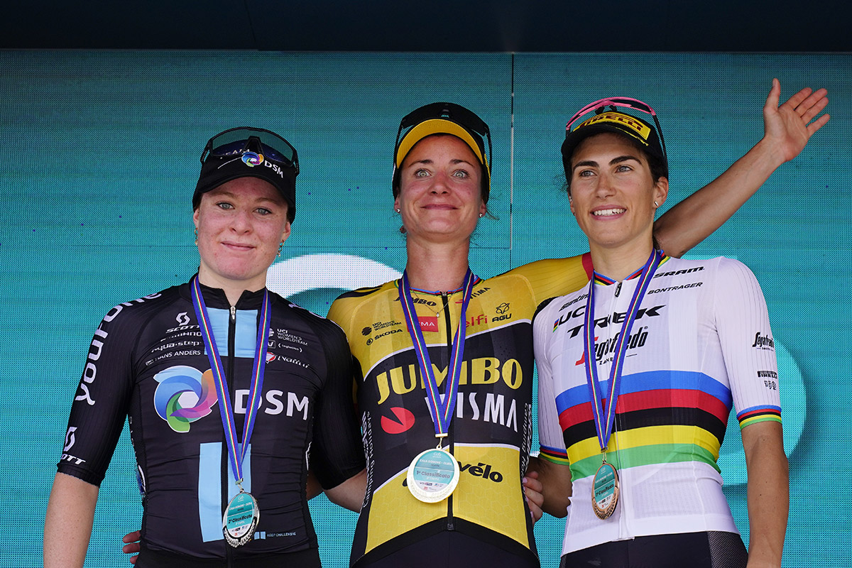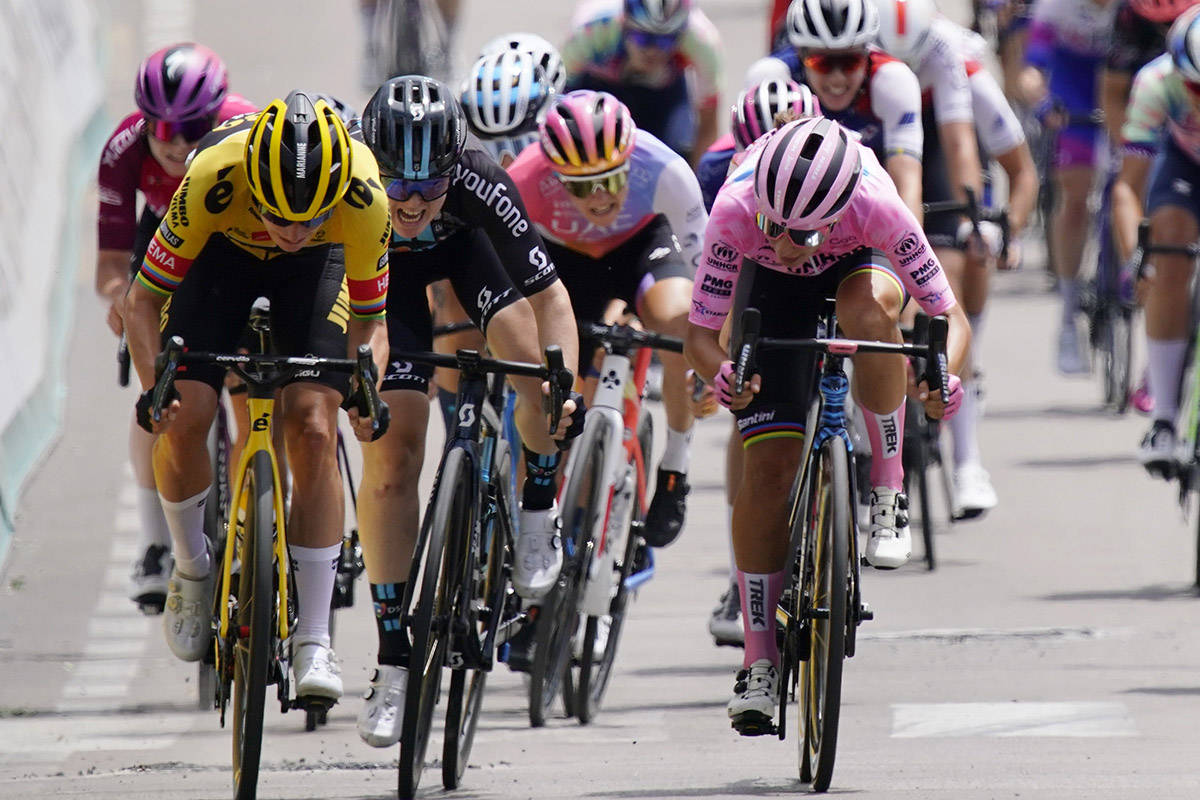 Spettacolare lo spunto dell’olandese, capace di anticipare i tempi sul lungo rettilineo in leggera ascesa lasciando sul posto Charlotte Kool (Team DMS, al suo secondo podio consecutivo) e l’iridata Elisa Balsamo, che conserva la maglia rosa di leader della classifica generale.