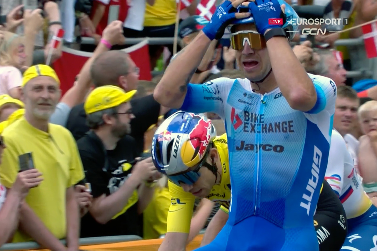 Nella convulsa volata di Sonderborg, l’olandese ha trovato un varco a centro strada, battendo con un colpo di reni un incredulo Wour Van Aert, che per il terzo giorno consecutivo taglia il traguardo in seconda posizione: la conquista della maglia gialla, per lui, è una magra consolazione.