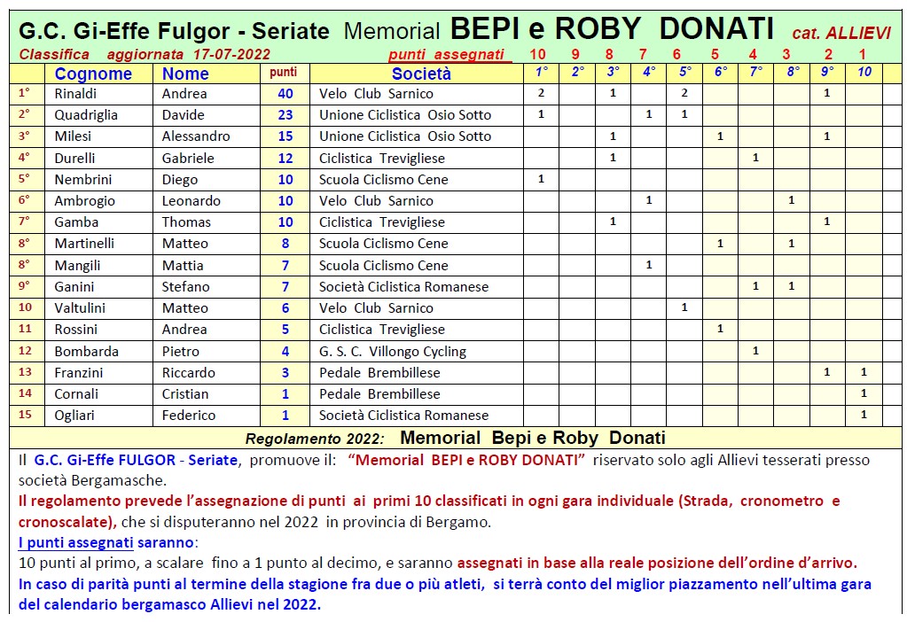 SERIATE (BG) – Anche nella stagione 2022 prosegue la tradizione del Memorial Bepi e Roby Donati, tradizionale premio che ogni anno va a premiare il miglior allievo di società bergamasca nelle gare disputate in provincia di Bergamo. L’iniziativa è promossa dal Gi-Effe Fulgor Seriate.