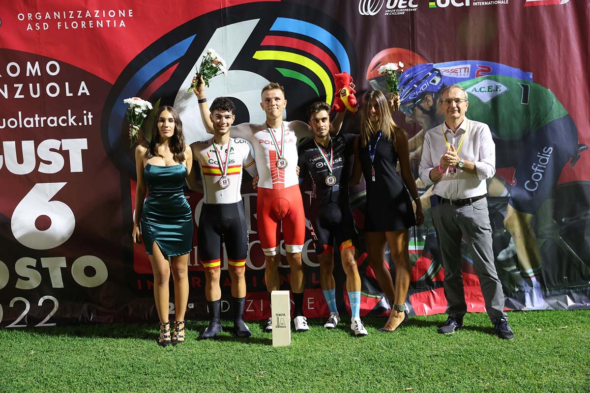 Nello scratch maschile di Classe 1 Uci (Gran premio GM Termosanitari), la vittoria del due volte campione del mondo Yauheni Karaliok è arrivata dopo un’azione che ha visto all’attacco lui e altri quattro uomini. I cinque si sono dunque giocati la vittoria allo sprint con una cinquantina di metri di margine sul gruppo e Karaliok ha rimontato lo svizzero Nicolò De Lisi. Terza posizione per Ivan Novolodskii, quarto il francese Hamon e quinto, migliore degli italiani, Michele Scartezzini. Vincitore della volata del gruppo e dunque sesto al traguardo è stato Mattia Pinazzi. A premiare gli atleti sul podio è stato l’ex professionista Samuele Marzoli, vincitore della 6 Giorni delle Rose nel 2004.