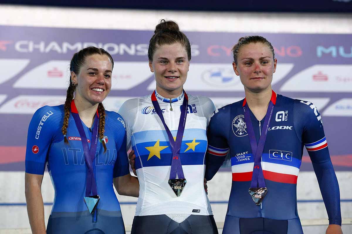 La medaglia d’argento, la prima in ordine di tempo, la conquista Silvia Zanardi nella corsa a punti. Già campionessa d’Europa U23, la 22enne piacentina corre con estrema sapienza tattica, lasciando andare soltanto la campionessa del mondo Lotte Kopecky. Ben condotta da Marco Villa a bordo pista, l’azzurra controlla la francese Berteau e la sopravanza negli sprint che contano: “Sinceramente volevo vincere, ma oggi Lotte era veramente imprendibile. Mi sono concentrata sulla francese e la britannica.”