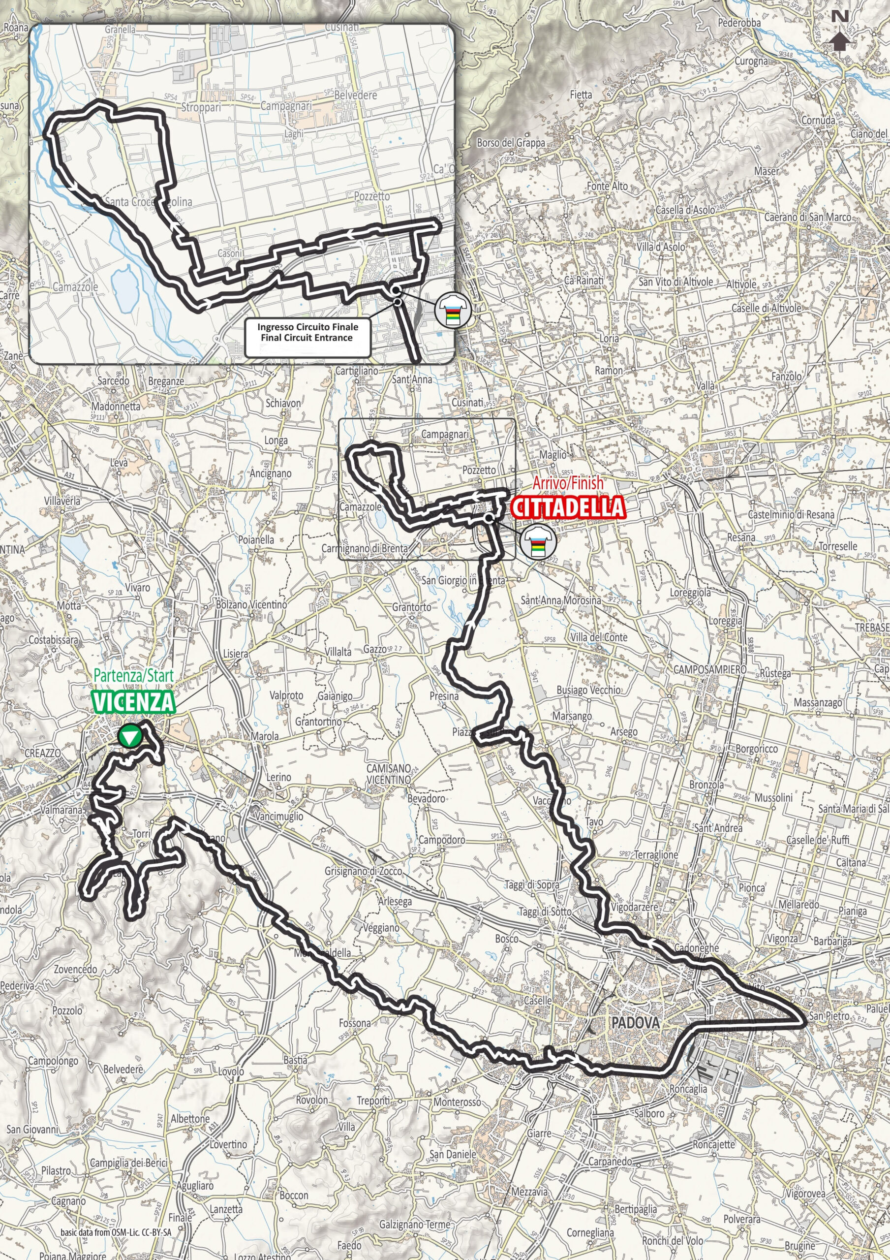 Il campionato del mondo Gravel promette selezione sin dai chilometri iniziali, nei quali sono concentrate le principali difficoltà altimetriche. Dopo la partenza in Campo Marzo a Vicenza i concorrenti si troveranno di fronte la ripida salita del santuario di Monte Berico e i successivi dislivelli di Valle dei Vicari, Sant’Agostino, la Pilla e Arcugnano, prima di costeggiare il lago di Fimon e proseguire verso Montegaldella. I successivi 80 chilometri, tutti pianeggianti, sono in provincia di Padova: Selvazzano, Tancarola, Padova, Noventa e, lungo l’argine destro del fiume Brenta, Limena, Piazzola sul Brenta e Cittadella. A questo punto gli uomini élite e i concorrenti delle categorie maschili Under 49 entreranno in un ampio circuito che attraversa i territori comunali di Cittadella e di Tezze sul Brenta, quindi a cavallo fra le province di Padova e Vicenza. Il traguardo sarà posto in piazza Pierobon, il cuore della città murata.