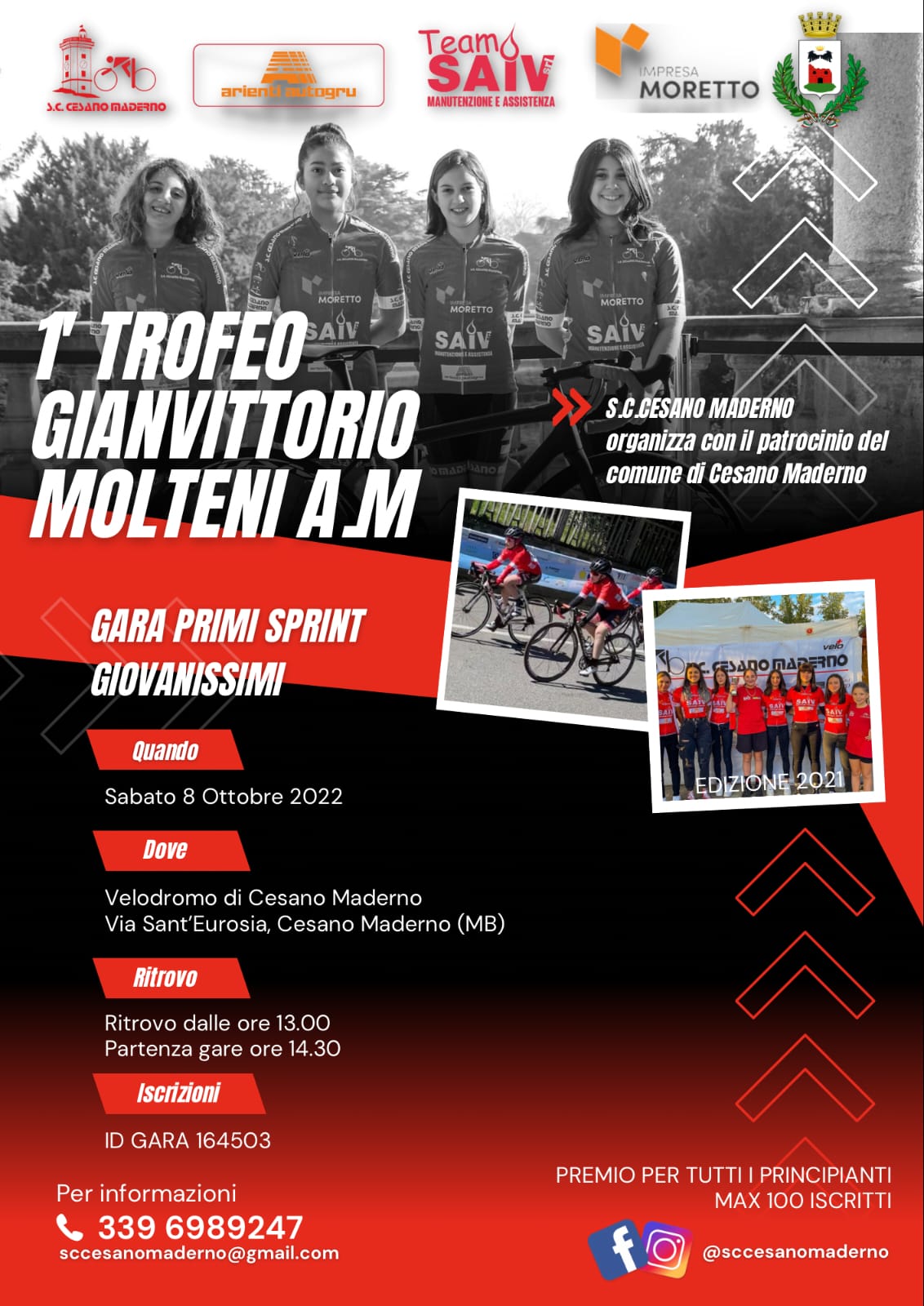 CESANO MADERNO (MB) – Sabato 8 ottobre al Velodromo di Cesano Maderno, in via Sant’Eurosia è in programma il 1° Trofeo Gianvittorio Molteni a.m. gara primi sprint riservata alla categoria Giovanissimi.