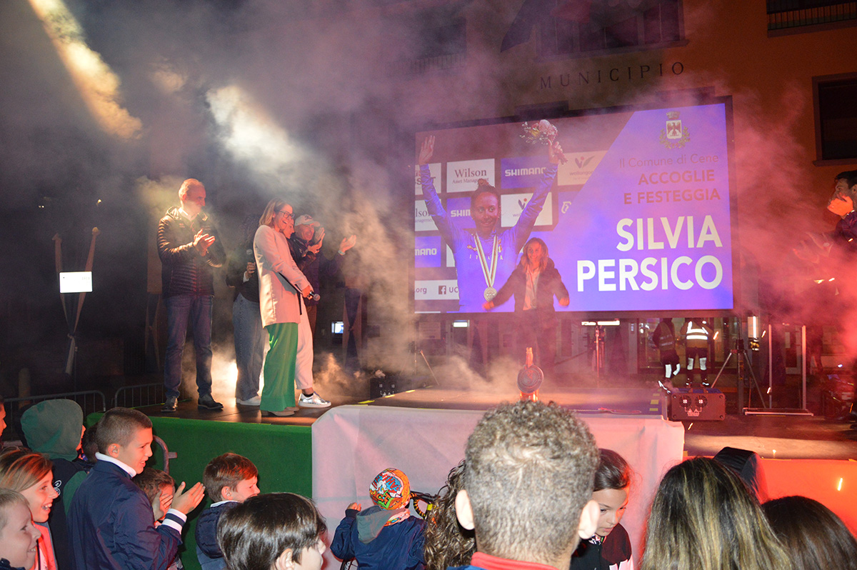 CENE (BG) – La giornata era già di quelle che lasciano il segno. Ritorno a Bergamo dopo un infinito volo dall’Australia, una medaglia di bronzo al collo e l’ufficializzazione del passaggio all’UAE Team ADQ, dopo 12 stagioni vissute nella Valcar – Travel & Service, società che lei stessa ha sempre considerato una seconda famiglia. E ad aumentare il carico di emozioni vissute da Silvia Persico ci ha pensato il paese di Cene, che in tempi record ha allestito una festa in onore della sua campionessa.