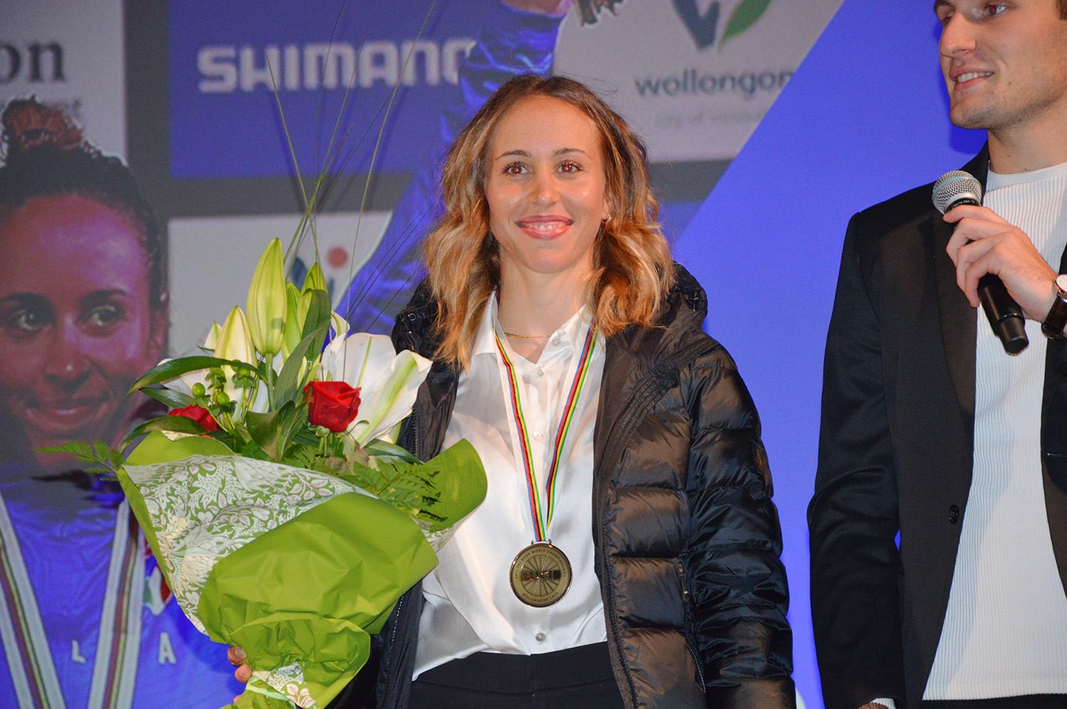 L’arrivo sul palco della due volte bronzo iridato Silvia Persico