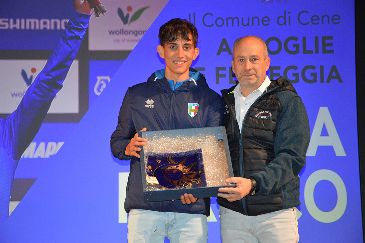 Se Valentino Villa ha avuto il suo ben da fare per vincere l’emozione, il presidente della Scuola Ciclismo Cene Giuseppe Maffeis non ci ha nemmeno provato a impossessarsi del microfono, limitandosi ad abbracciare Silvia e a consegnarle un riconoscimento. Riconoscimento che è stato tributato a un altro atleta che ha tenuto in alto i colori di Bergamo al mondiale di Wollongong: Simone Gualdi, junior classe 2005 della Scuola Ciclismo Cene che in Australia ha vissuto la sua prima rassegna iridata.