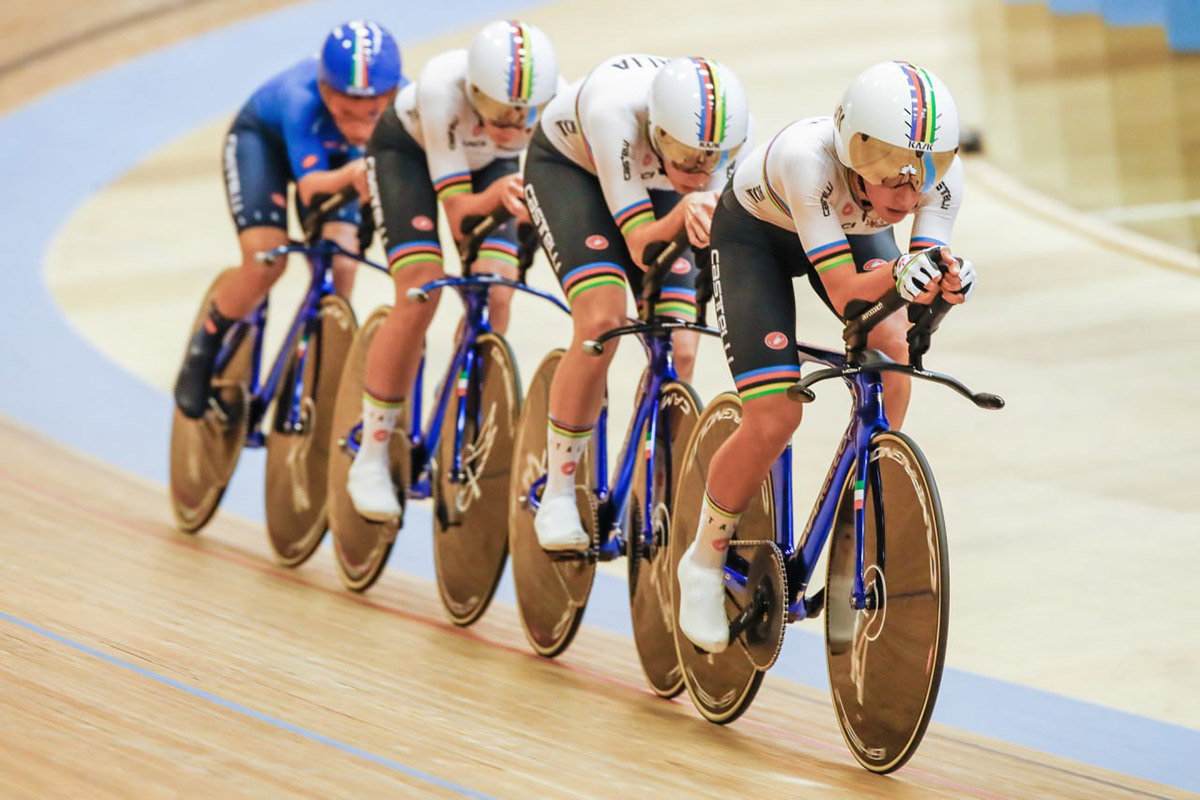 Meno positivo il risultato cronometriche delle campionesse del mondo. Il quartetto azzurro, formato da Elisa Balsamo, Martina Fidanza, Vittoria Guazzini e Letizia Paternoster ha chiuso la prova con il tempo di 4.14.227, tre secondi più lente delle tedesche. Domani sera la sfida sarà con le francesi, che nelle qualifiche hanno fatto segnare un 4.16.149 che non può far dormire sogni tranquilli alle ragazze di ct Marco Villa.