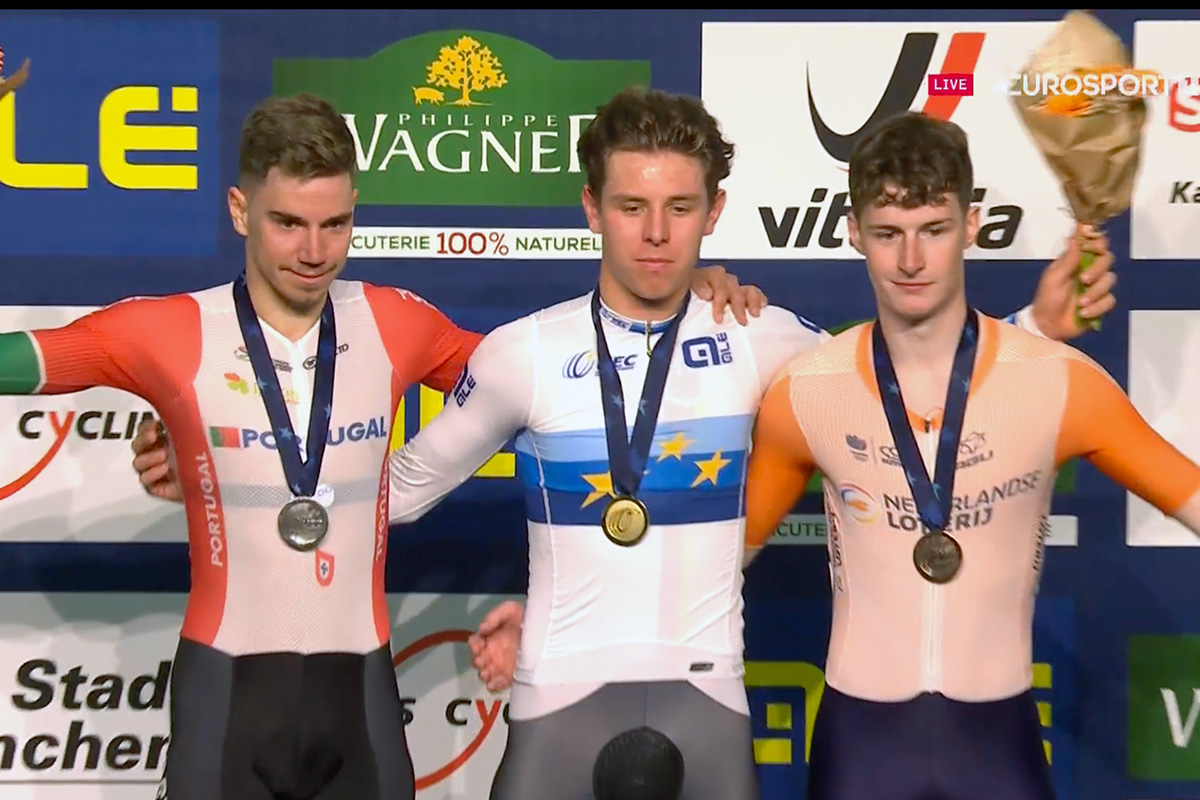 GRENCHEN (SUI) – Vanno al collo della portoghese Maria Martins e del tedesco Tim Torn Teutenberg (nella foto sul podio) le prime medaglie d’oro degli Europei in pista di Grenchen.