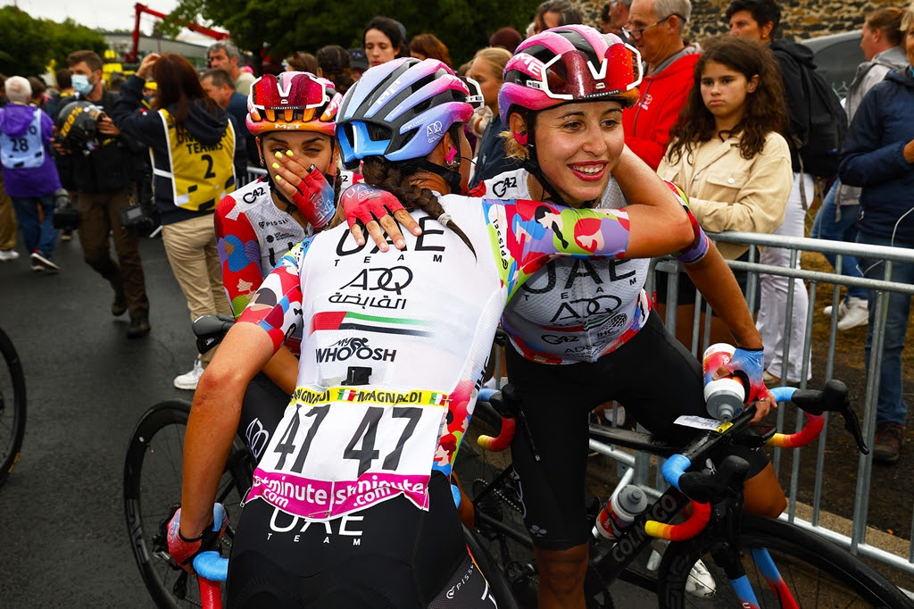 MAURIAC (FRA) – Sono passati esattamente 364 giorni da quando Silvia Persico fece innamorare i tifosi francesi e tutti gli appassionati del mondo a Provins, dove chiuse al secondo posto la seconda frazione del Tour de France 2022 vestendo ‘virtualmente’ la maglia gialla fino a pochi chilometri dall’arrivo. E anche in questa edizione la bergamasca di UAE Team ADQ si è confermata tra le protagoniste della seconda tappa chiudendo al terzo posto, preceduta solo dalla campionessa tedesca Liane Lippert e dalla campionessa belga, nonché maglia gialla, Lotte Kopecky (nella foto di Sprint Cycling Agency, l’atleta abbracciata dalle compagne di squadra).
