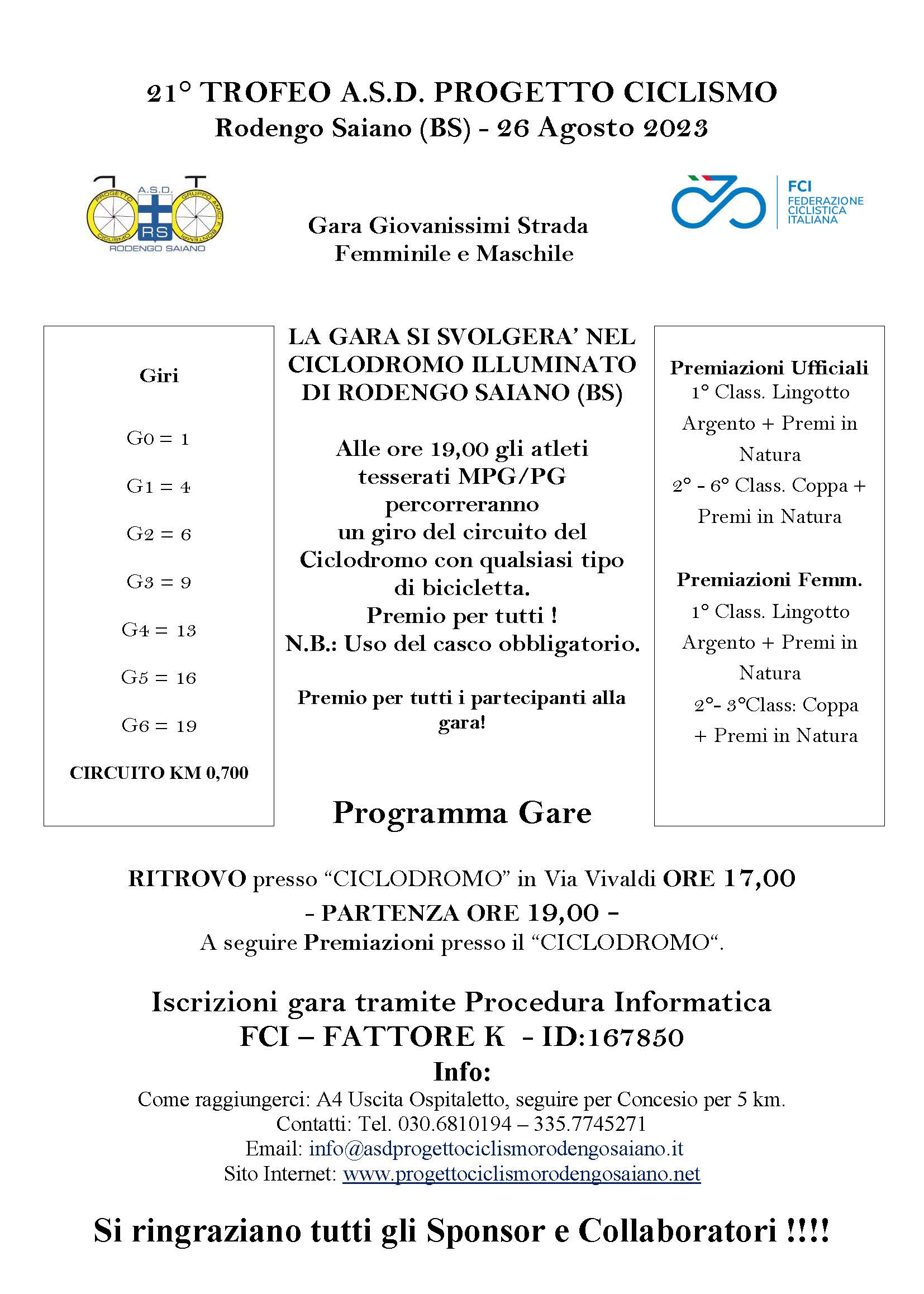 RODENGO SAIANO (BS) – Sabato 26 agosto al ciclodromo illuminato di Rodengo Saiano (Brescia) torna l’appuntamento per la categoria Giovanissimi, abbinato al 21° Trofeo A.S.D. Progetto Ciclismo.