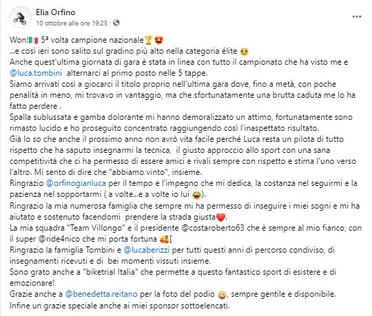 A comunicare a tutti il successo ottenuto, dopo una stagione combattuta con il rivale Luca Tombini, è stato lo stesso Elia Orfino che sui propri social ha esternato la sua gioia. Cinque tappe che hanno visto prevalere il bergamasco.