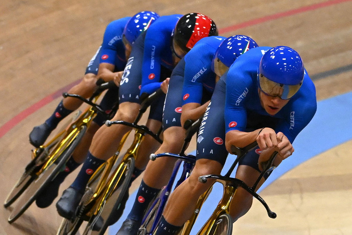 Saranno 19 i corridori italiani impegnati sulla pista olandese di Apeldoorn tempio della disciplina, con i pass olimpici e 22 titoli in palio (11 per genere). L’Italia difende i tre titoli europei di Grenchen 2023 con Simone Consonni (corsa a punti), Jonathan Milan (inseguimento individuale) e il quartetto dell’inseguimento a squadre maschile (nella foto di apertura di Getty Images).