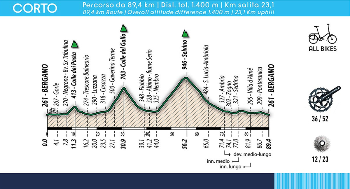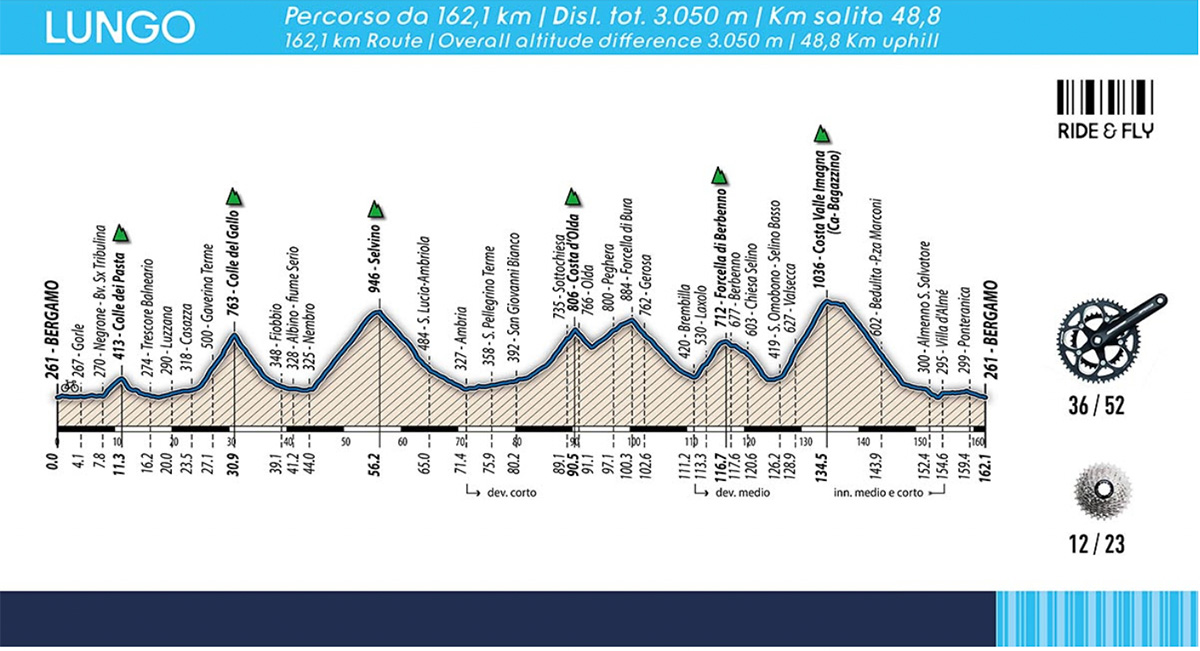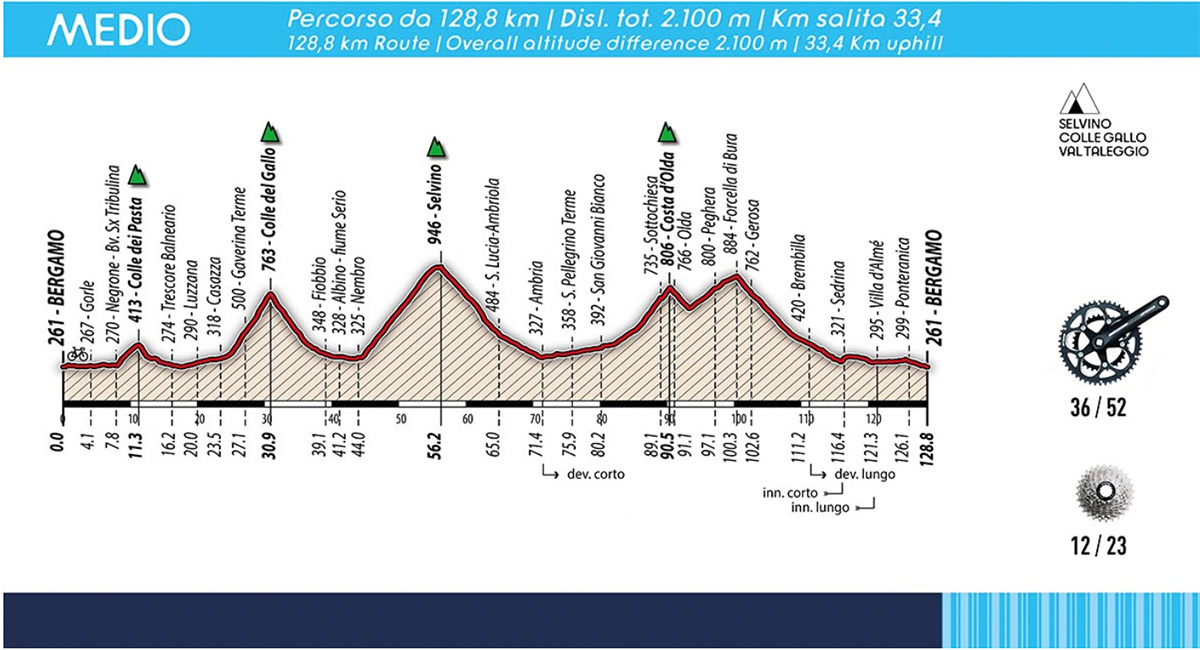 Il tragitto è comune a tutti fino al km 71, all’altezza di Ambria: dopo aver scollinato la mitica ascesa del Selvino, il percorso corto devia fino a tornare al traguardo, mentre il medio e il lungo continuano in direzione Costa d’Olda e Forcella di Bura. Completata la discesa fino a Brembilla (km 111), la distanza intermedia vira verso l’arrivo, mentre i più coraggiosi che decideranno di affrontare la lunga distanza avranno ancora due ascese di livello da affrontare, per giungere alla Forcella di Berbenno prima e a Costa Valle Imagna poi, dove l’ultimo tratto in picchiata riporterà la carovana verso il traguardo di Bergamo.