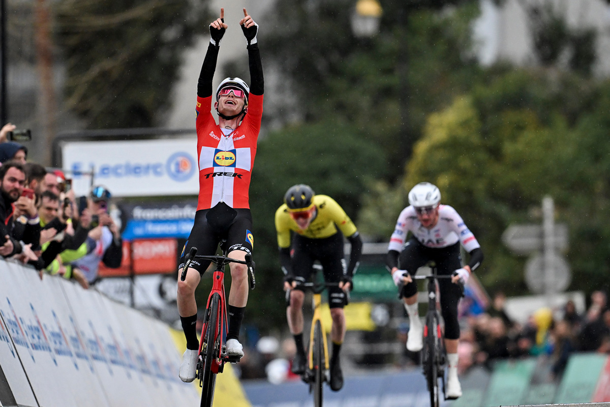 LA COLLE SUR LOUP (FRA) – Ci si aspettava il duello tra Roglic ed Evenepoel, con Buitrago e Bernal nel ruolo di outsiders; invece la prima delle tre decisive tappe della Parigi-Nizza incorona il danese Mattias Skjelmose (Lidl Trek), che si è imposto a La Colle Sur Loup precedendo in uno sprint a tre Brandon McNulty (UAE Team Emirates) e Matteo Jorgenson della Visma | Lease a Bike (nella foto A.S.O. Billy Ceusters, l’esultanza del danese).