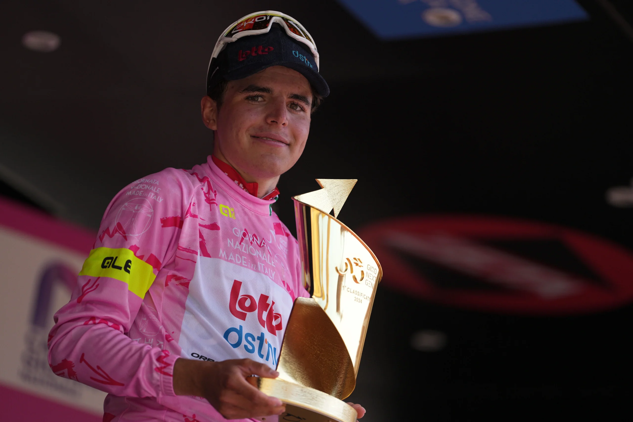Maglia Rosa, leader della Classifica Generale, sponsorizzata da Mimit – Ministero delle Imprese e del Made in Italy – Jarno Widar (Lotto Dstny Development Team)