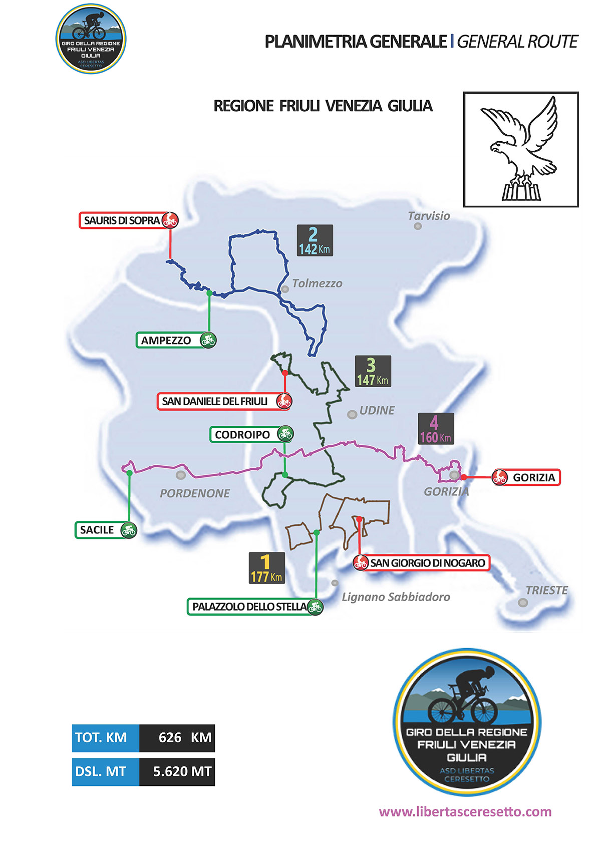 Il percorso è suddiviso in quattro tappe che – secondo abitudine – vanno a toccare diverse aree e province della Regione per un tracciato complessivo di 626 chilometri e un dislivello complessivo di 5.620 metri. Teatro del gran finale del corsa quest’anno sarà la città di Gorizia.