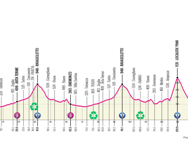 1° categoria. Una tappa molto esigente che avrà ancora la zona della Carnia come splendido scenario della sfida tra i migliori scalatori del Giro.