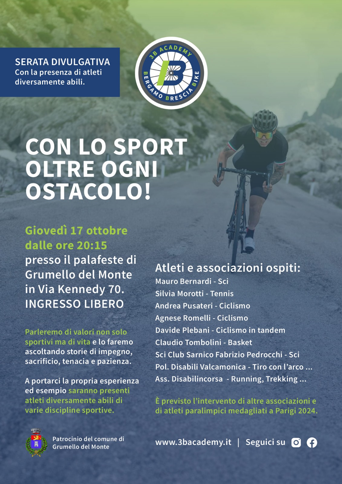 GRUMELLO DEL MONTE (BG) – Si terrà giovedì 17 ottobre a Grumello del Monte la serata organizzata dalla 3B Academy – Travel & Service Cycling Team per parlare di sport.