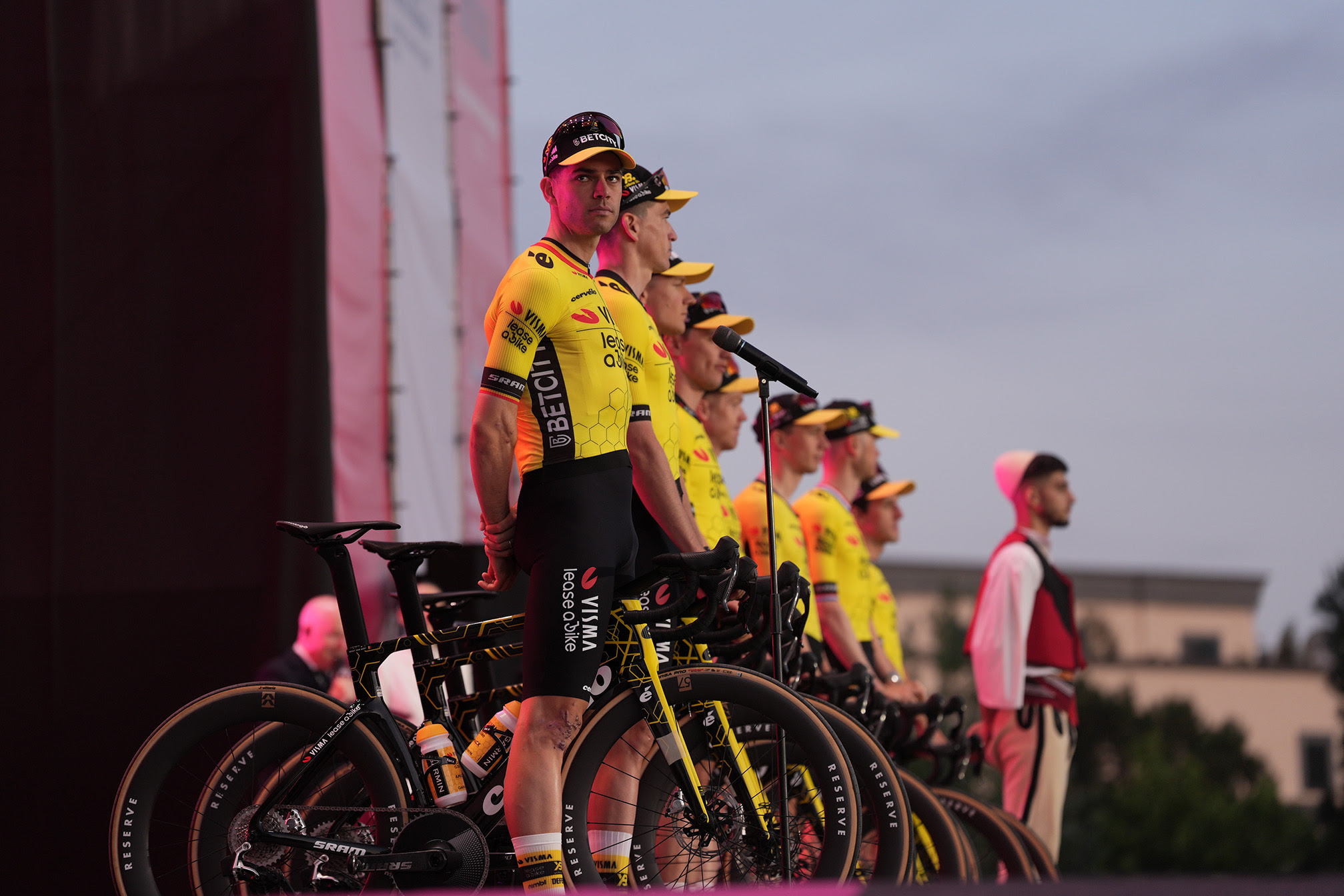 TEAM VISMA | LEASE A BIKE during the teams presentation ahead of the Giro d’Italia cycling race in Tirana. The race starts on Friday, May 9, with the first stage over 160 km, from Durazzo (Durres) to Tirana (Tirane), Albania- Wednesday, May 7, 2025. Sport – cycling. (Photo by Massimo Paolone/LaPresse)
