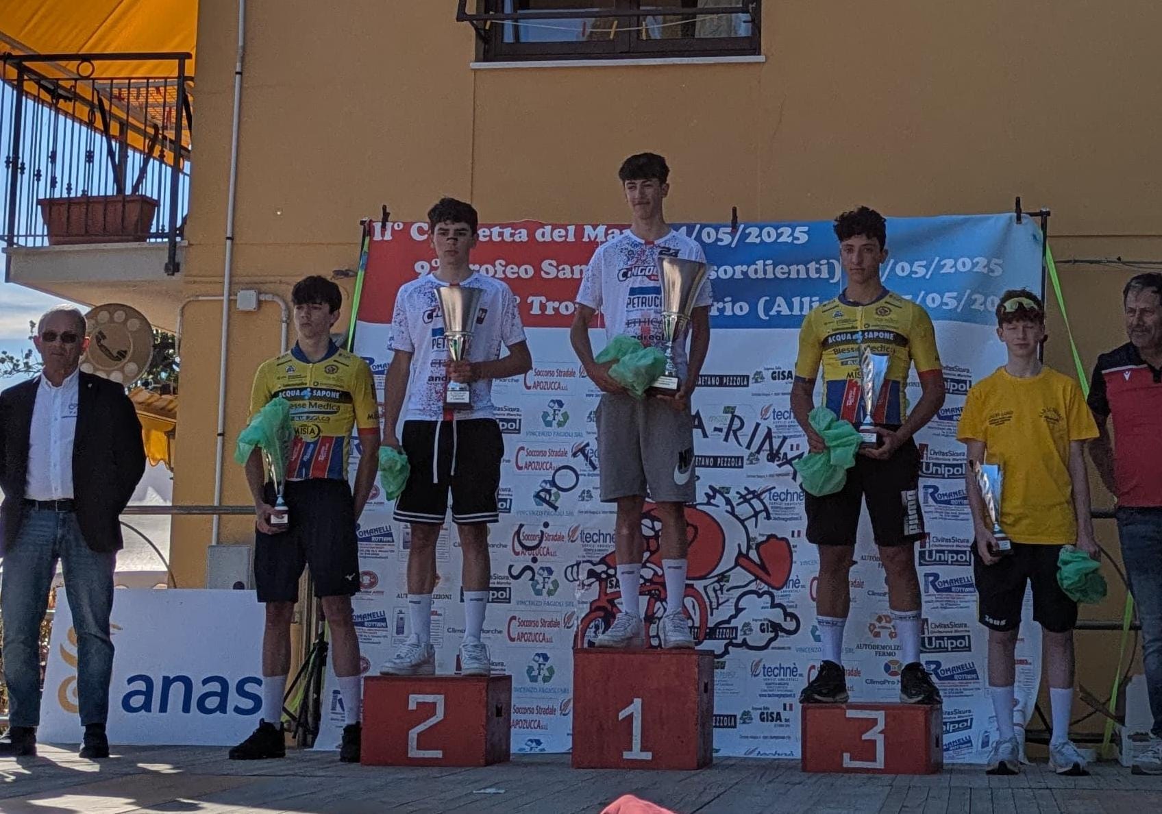 A San Girio di Potenza Picena (MC), in occasione della 48ª edizione del Trofeo San Girio, la squadra ha conquistato i primi due gradini del podio nella categoria Allievi grazie a un’impeccabile prova corale. Gianmarco Paolinelli ha tagliato per primo il traguardo dopo 63 km corsi alla media di 37,426 km/h, precedendo di dieci secondi il compagno di squadra Andrea Gabriele Alessiani. Un’azione perfetta, nata da un ottimo gioco di squadra in un gruppo ridotto – solo 11 atleti al via per Zero24 – e gestita con intelligenza anche nei tratti di sterrato, inconsueti per molti.