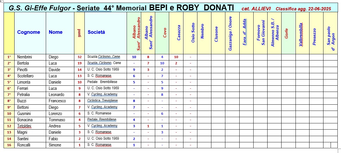 SERIATE (BG) – Messa in archivio la prima parte di stagione e con le prime cinque prove dell’anno alle spalle, facciamo il punto sulla classifica del Memorial Bepi e Roby Donati, tradizionale riconoscimento che ogni anno va a premiare il miglior allievo di società bergamasca nelle gare disputate in provincia di Bergamo.