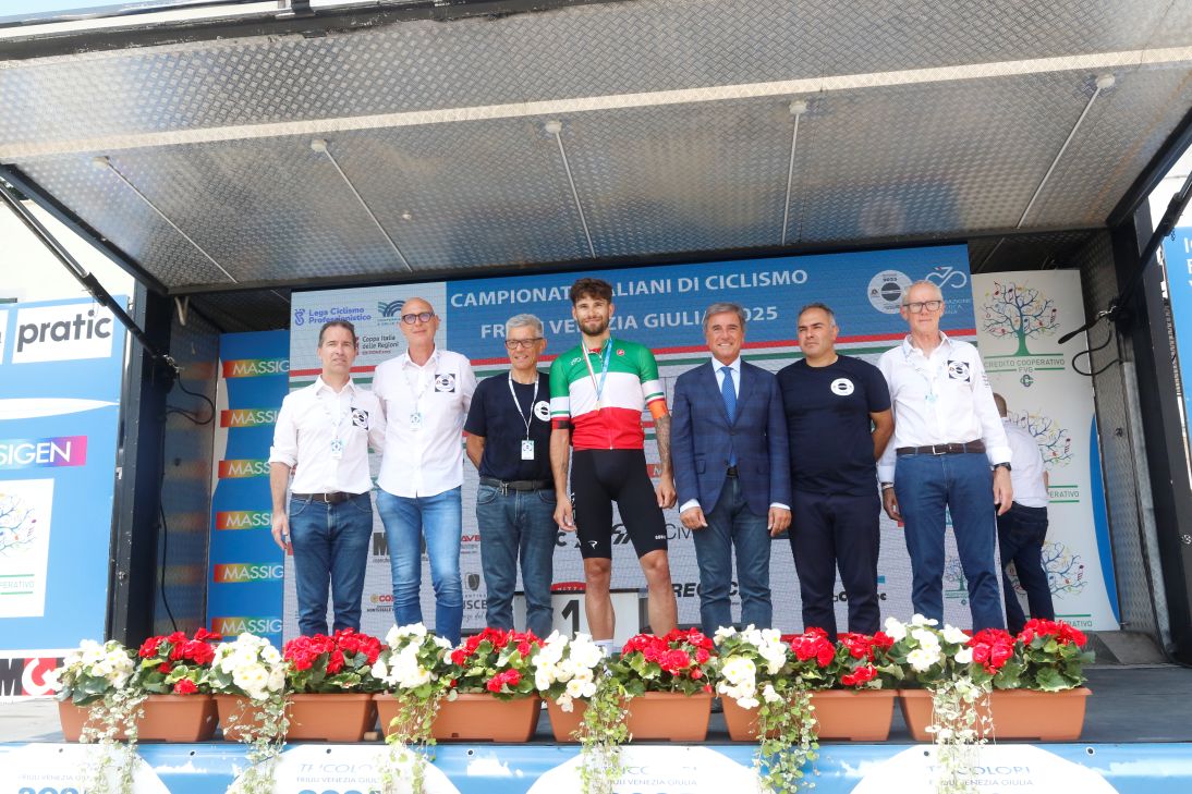 Dopo i tricolori vinti ieri dagli allievi Matilde Carretta e Tommaso Cingolani, e dagli juniores Elena De Laurentiis e Riccardo Capello, Cellina Bike e Libertas Ceresetto hanno organizzato magistralmente un’altra grande giornata di sport. Tra gli altri, alle cerimonie protocollari erano presenti anche il presidente della Lega del Ciclismo Professionistico Roberto Pella, il vice presidente FCI Stefano Bandolin, il presidente FCI Friuli-Venezia-Giulia Michele Bevilacqua, i sindaci Alberto Bernava (San Vito al Tagliamento) e Elena Maiolla (Morsano al Tagliamento). Per il comitato organizzatore c’erano Mauro Francescon e Nevio Alzetta per Cellina Bike, Andrea CecchiniChristian Murro e Fulvio Bulfoni per Libertas Ceresetto.