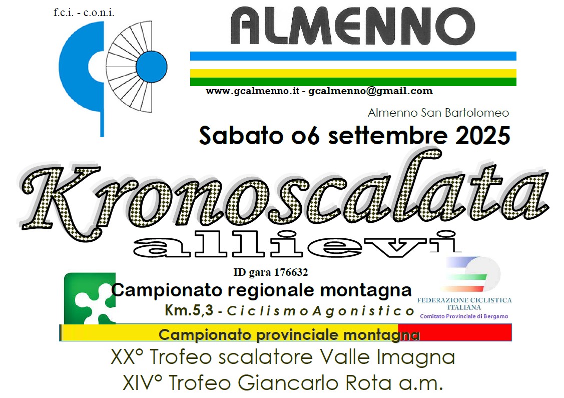 ALMENNO SAN BARTOLOMEO (BG) – Sabato 6 settembre tornerà l’appuntamento per la categoria Allievi con la classica Cronoscalata Almenno – Albenza, abbinata al 20° Trofeo Scalatore Valle Imagna – 14° Trofeo Giancarlo Rota a.m., prova valida anche per l’assegnazione del Campionato Regionale Lombardo della Montagna.