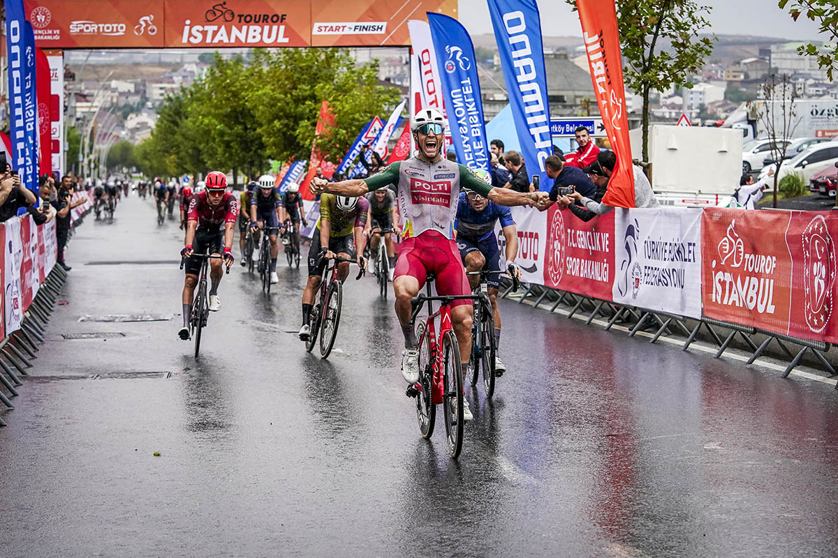ARNAVUTKOY (TURCHIA) – Continua il gran momento di Giovanni Lonardi: dopo il successo di domenica a Plouay e il podio di ieri nella prima volata del Tour of Istanbul, oggi si è aggiudicato la terza tappa della corsa turca. In una giornata dal meteo difficile, che ha indotto gli organizzatori a neutralizzare i distacchi a 5 km dall’arrivo ma non certo ad annullare la gara, il velocista del Team Polti VisitMalta ha mostrato tutto il suo valore vincendo la volata sul bagnato davanti a Jeanniere (Total Energies) e gli altri avversari.