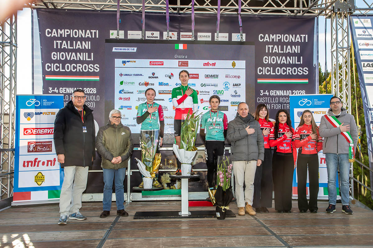 Nel giro conclusivo Anzisi trova il sorpasso decisivo tra gli olivi e va a conquistare la maglia tricolore dei Campionati Italiani Giovanili di Ciclocross 2026. Carretta chiude seconda, mentre Matilde Anselmi (Cx Devo Academy) completa il podio al terzo posto dopo una bella rimonta. Beatrice Mainfrè (Tirano Bike) è quarta, seguita da Nicole Trampus (ASD GS Sorgente Pradipozzo) quinta.