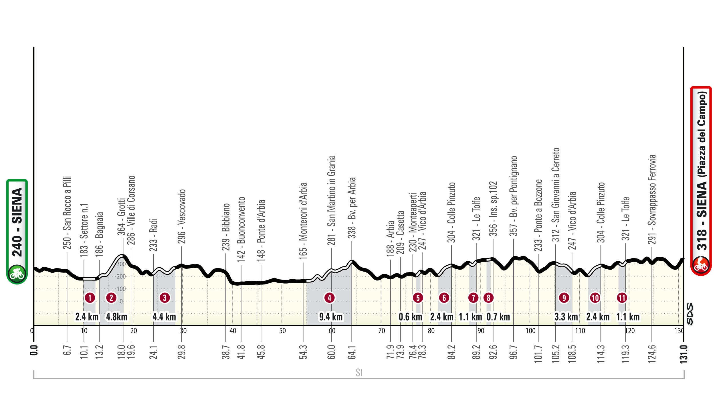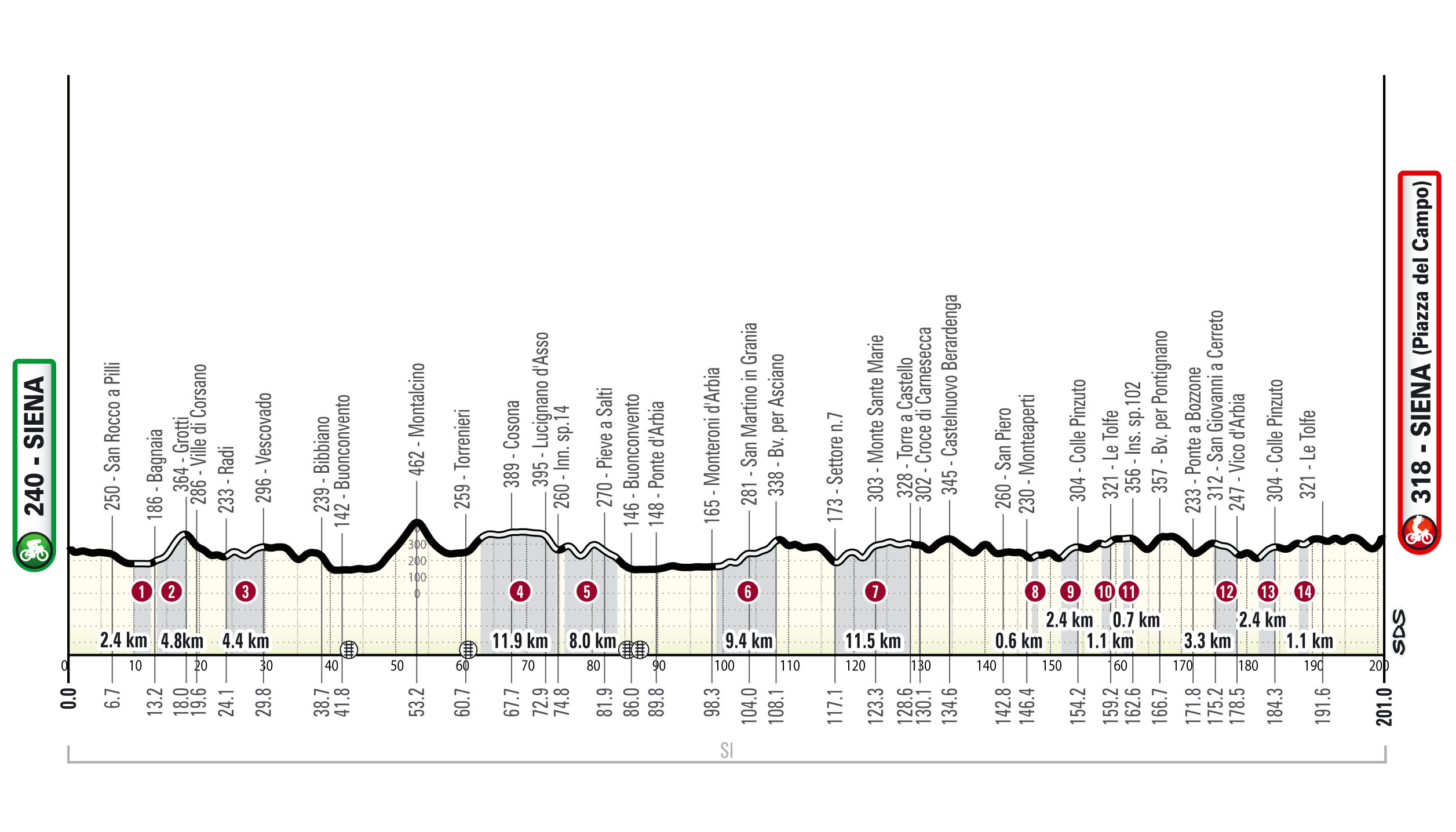 Gli ultimi km si snodano per la prima parte all’esterno dell’abitato di Siena su strade larghe e lunghi rettifili collegati tra loro da ampie curve, prima in discesa e poi in leggera salita fino ai 2 km dall’arrivo dove viene imboccata la via Esterna di Fontebranda con pendenze fino al 9%. A 900 m dall’arrivo si supera la Porta di Fontebranda e inizia la pavimentazione lastricata. La pendenza supera il 10% fino a raggiungere attorno ai 500 m dall’arrivo, in via Santa Caterina, punte del 16%. Segue una svolta decisa a destra nella via delle Terme e l’immissione in via Banchi di Sotto. Dai 300 m la strada è sempre in leggera discesa. Ai 150 m svolta a destra in via Rinaldini. Ai 70 m si entra nel Campo, ultimi 30 m in discesa al 7%, traguardo pianeggiante.