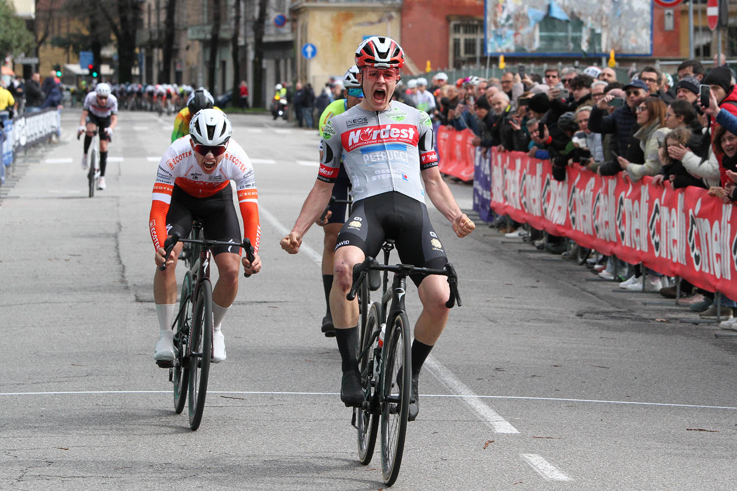 Clima da classica del nord, con pioggia e temperature invernali a fare da sfondo alla sfida varesina animata da subito proprio dal talento scaligero. Passano appena 20 chilometri e Guido Viero è già in fuga in compagnia di altri otto attaccanti. L’azione si esaurisce nel corso dell’ultima delle tornate ondulate che caratterizzano la Piccola San Geo: a quel punto, a ripartire in contropiede sono altri due alfieri della formazione del Presidente Alberto Murari. Si tratta di Erik Zanolini e Patrik Pezzo Rosola che escono in avanscoperta all’interno di un quartetto. La loro azione mette alla frusta l’intero gruppo e, quando il plotone torna compatto, è nuovamente Guido Viero ad allungare. Questa volta l’alfiere del Team Nordest Petrucci Assali Stefen va in fuga in compagnia di Martinelli (Ecotek), Gamba (Trevigliese), Mazzoleni (Guerrini) e Minoia (Biesse). I cinque si presentano sul lungo rettifilo d’arrivo con una manciata di secondi di vantaggio sul gruppo: è quanto basta per andare a giocarsi il successo in un combattuto sprint a ranghi ristretti nel quale prevale nettamente Guido Viero che taglia così la linea del traguardo sorridente e a braccia alzate