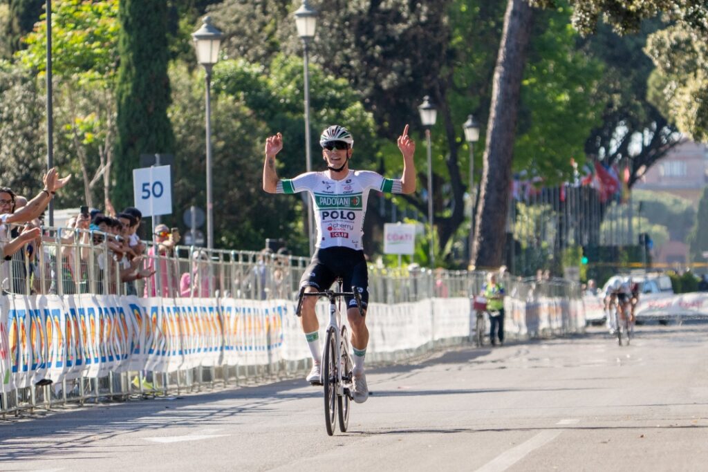 Quella che si materializza nella Città Eterna, davanti agli occhi federali del c.t. della Nazionale U23 Marino Amadori e del segretario generale F.C.I. Marcello Tolu, è una doppietta della Padovani: ad aggiudicarsi l’ambita maglia azzurra realizzata da Giessecygling (laboratorio di maglie da ciclismo personalizzate, punto di riferimento nel Centro Italia) è stato Mirko Bozzola, già vincitore del Liberazione Juniores nel 2022 con l’Aspiratori Otelli, davanti a Riccardo Lorello. Molti si aspettavano che sarebbe stato Lorello, vincitore del Trofeo Piva e autore di piazzamenti pure in gare professionistiche, a lanciare la zampata vincente. Invece è stato Bozzola, che ha tagliato il traguardo con le braccia commosse al cielo per dedicare il successo al compianto compagno di squadra Kevin Bonaldo, venuto a mancare lo scorso autunno. Completa il podio il generoso Tommaso Anastasia, della Technipes #InEmiliaRomagna con dieci secondi di margine sul compagno Marco Martini.