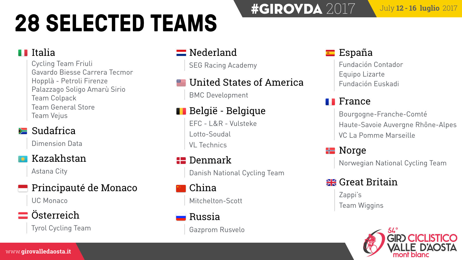 Giro Valle d’Aosta 2017: scelte le 28 squadre, da 15 nazioni