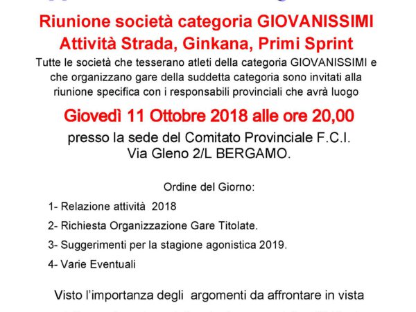 Il Comitato Provinciale di Bergamo della FCI comunica che giovedì 11 ottobre è stata programmata una riunione per le società della categoria Giovanissimi.