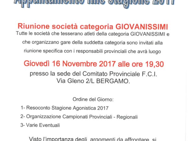 Il Comitato di Bergamo della Federazione Ciclistica Italiana ha indetto una riunione rivolta a tutte le società bergamasche della categoria Giovanissimi su strada.