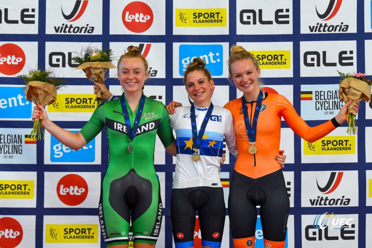 Il podio del Campionato Euroepo Corsa a punti Donne Junior vinto da Matilde Vitillo (foto UEC/BettiniPhoto)
