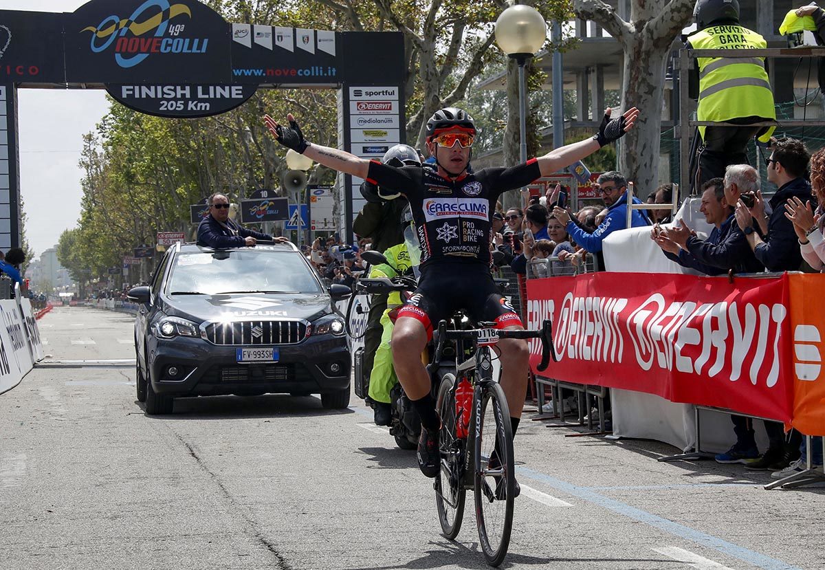 Un assolo invece ha coronato l’arrivo del percorso lungo. Federico Colone, che lavora in un negozio di biciclette, si è aggiudicato la 49^ Nove Colli, giunto sul traguardo con un distacco di una trentina di secondi sui primi 8 inseguitori regolati allo sprint da Tommaso Elettrico, poi squalificato per cambio di bici (non è ammesso nelle prove granfondistiche l’assistenza privata, ndr), davanti a Marco Morrone e Fabio Cini.