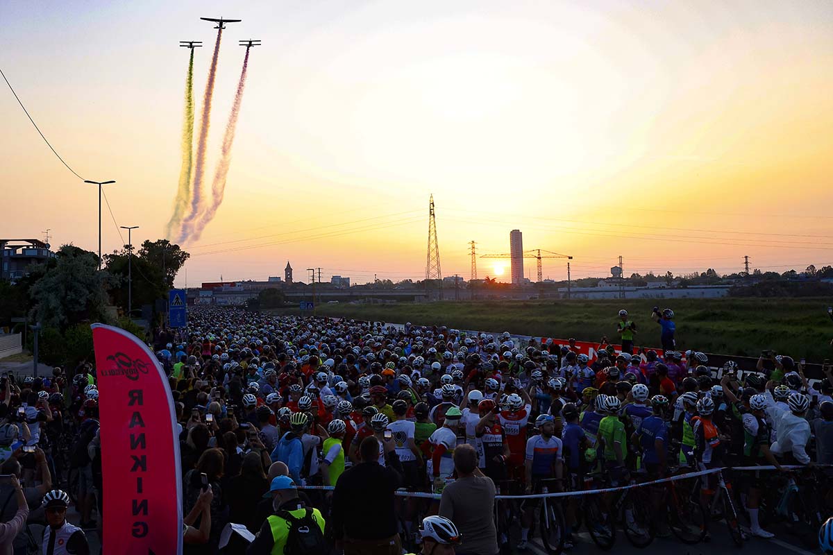 Dei 9000 e oltre iscritti, sono partiti 7843 cicloamatori nella sempre splendida cornice dell’alba sul Porto Canale con le storiche griglie schierate da ben prima delle sei del mattino, orario ufficiale di partenza. Ad aumentare lo spettacolo anche le frecce tricolori “storiche” che hanno fatto tenere per un po’ il naso all’insù a tutti gli appassionati. La giornata, più estiva che primaverile, ha regalato un bellissimo sole ai cicloamatori che poi hanno affollato il villaggio della colonia Agip per godersi le medaglie – quest’anno ancora più belle in legno riciclato – e il pasta party che per la prima volta ha visto due accessi in modo da smaltire meglio la coda.