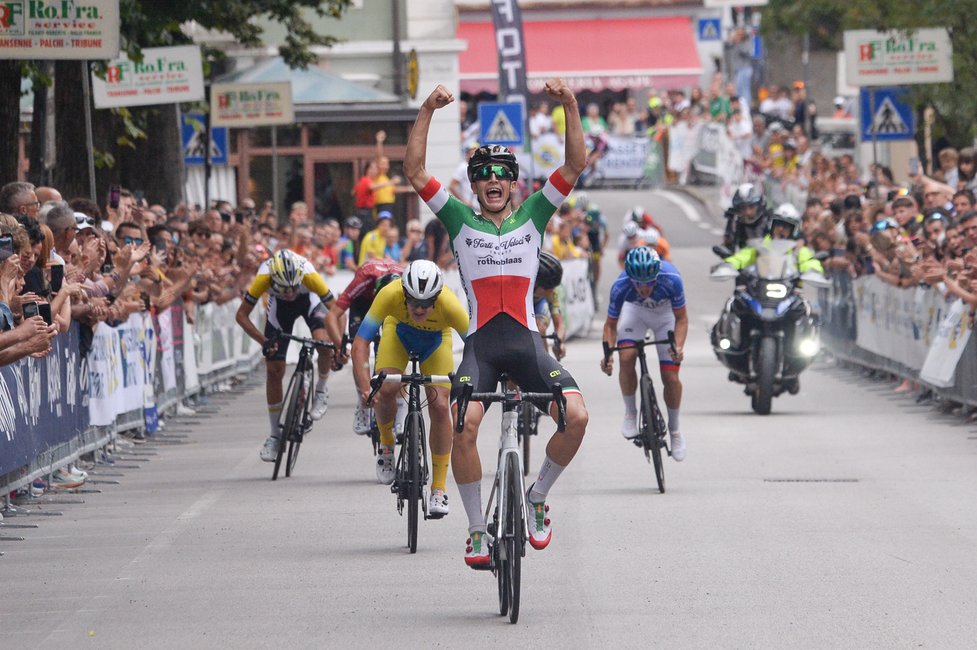 Dapprima si è sganciato dal plotone, già selezionato, il toscano Edoardo Agnini, poi il brianzolo Filippo Colella (Biassono), che si è portato alla ruota del battistrada ed è andato a vincere il Gpm di Telve, posto al secondo dei tre passaggi previsti in vetta all’ascesa. Nulla da fare nemmeno per lui, perché al suono della campana che indicava l’inizio dell’ultimo giro il gruppo dei migliori è tornato compatto, con Fedrizzi nelle posizioni di testa. A quel punto si sono susseguiti gli scatti: deciso quello portato dal figlio d’arte Patrik Pezzo Rosola (Ausonia) e dal fiorentino Nicolò Cianti (Iperfinish), raggiunti in seconda battuta dal campione regionale veneto Matteo Rossetto, trevigiano della Borgo Molino. Cianti ha mollato la presa lungo le rampe finali della salita di Telve, dove è transitato per primo Pezzo Rosola, tallonato da Rossetto. Alle loro spalle, distanziati di 35”, un gruppetto guidato dal veronese Guido Viero e dal tricolore Fedrizzi. Un distacco difficile da colmare. I due fuggitivi sembravano potersi giocare la vittoria che vale un’intera stagione, ma non avevano fatto i conti con le doti di discesista di Viero e con la verve di Brandon Fedrizzi. I battistrada sono stati ripresi all’entrata nell’abitato di Borgo Valsugana. Poi la decisiva volata a ranghi ristretti, vinta, dominata dal campione italiano: la Coppa d’Oro numero 56 è di Brandon Fedrizzi e del suo direttore sportivo Claudio Caldonazzi, che ha brindato a uno storico bis.