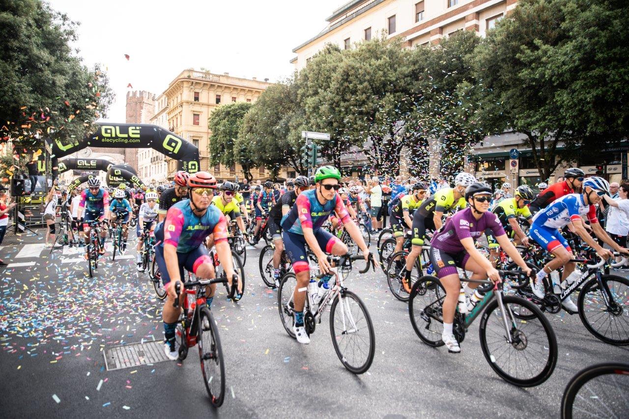 Alla partenza, oggi, Alessia Piccolo (l’amministratore delegato di APG, l’azienda a cui Alé fa capo) e nomi eccellenti come il campione della Bahrain Victorious Sonny Colbrelli col fratello Tomas, Edoardo Zambanini (Bahrain Victorious), Davide Gabburo (Bardiani CSF), l’ex vicecampione del mondo a cronometro Adriano Malori, Matteo Badilatti e Valter Attila (Groupama FDJ), gli ex pro Lello Ferrara e Pietro Caucchioli, l’ex campionessa mondiale su strada Alessandra Cappellotto, il cantante Paolo Belli e l’ex calciatore Fabrizio Ravanelli oltre al ex-campione spagnolo Fernando Escartin.