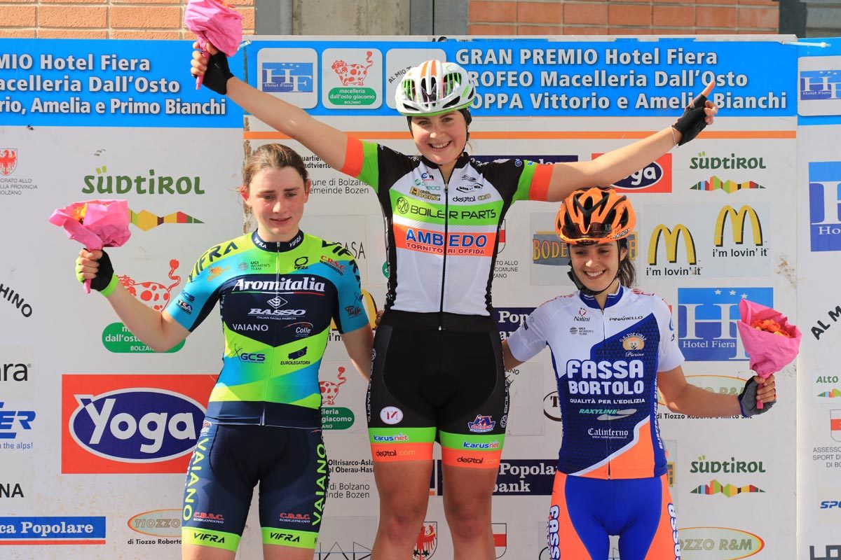 BOLZANO (BZ) – Anastasia Carbonari (Born to Win) ha vinto la gara Donne Open abbinata al 7° Gran Premio Hotel Fiera di Bolzano, ha superato allo sprint Letizia Borghesi (Aromitalia Vaiano) e Greta Marturano (Top Girls). Quarto posto per Gaia Masetti (Team Wilier Breganze) che si aggiudica la classifica delle Donne Junior.
