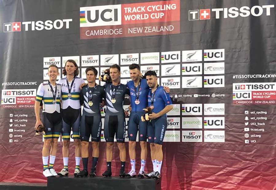 CAMBRIDGE (AUSTRALIA) – Che coppia, quella composta dagli azzurri Francesco Lamon e Michele Scartezzini: un duo che nella giornata di chiusura della quarta prova di Coppa del Mondo in Nuova Zelanda conquista uno splendido bronzo nel Madison uomini. In una corsa che ha visto la supremazia assoluta della coppia neozelandese Gate e Stewart, oro finale con 129 punti e 4 giri conquistati, davanti all’Australia, argento con 87 punti e tre giri conquistati, splende il bronzo dell’Italia con 57 punti e due giri conquistati.