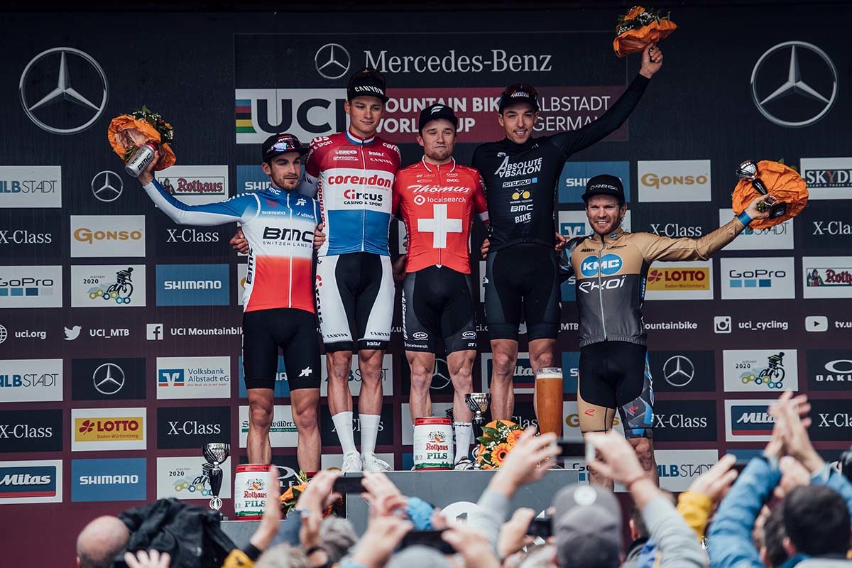 La pioggia che aveva graziato le ragazze, è scesa copiosa sulla prova maschile rendendo il percorso viscido e impegnativo. Il duello annunciato tra l’iridato Nino Schurter e l’emergente fuoriclasse Mathieu Van der Poel, dominatore dello short track, è iniziato appena è stato dato lo start. Il ritmo forsennato delle prime tornate e l’acquazzone che ha colpito Albstadt ha però riaperto i giochi e fatto pagare il conto al dominatore delle ultime stagioni. Mentre gli altri finiscono a terra (su tutti Lars Forster, caduto due volte e costretto al ritiro) o sono ormai a corto di energie dopo un avvio “a tutta”, lo svizzero Mathias Flückiger al quinto dei sette giri riesce a fare la differenza e ad andare a prendersi la sua seconda tappa di World Cup, dopo quella del 2018 a Mont Sainte Anne. Van der Poel coglie il secondo posto a 32″ dall’elvetico del Thömus RN Swiss Bike Team, precedendo allo sprint il francese Jordan Sarrou. Schurter, in difficoltà come non mai, termina solo sesto e a oltre un minuto e mezzo dal vincitore. Il campione d’Italia Gerhard Kerschbaumer chiude in 14a posizione. Nella top 20 anche il giovane Nadir Colledani, 17°.